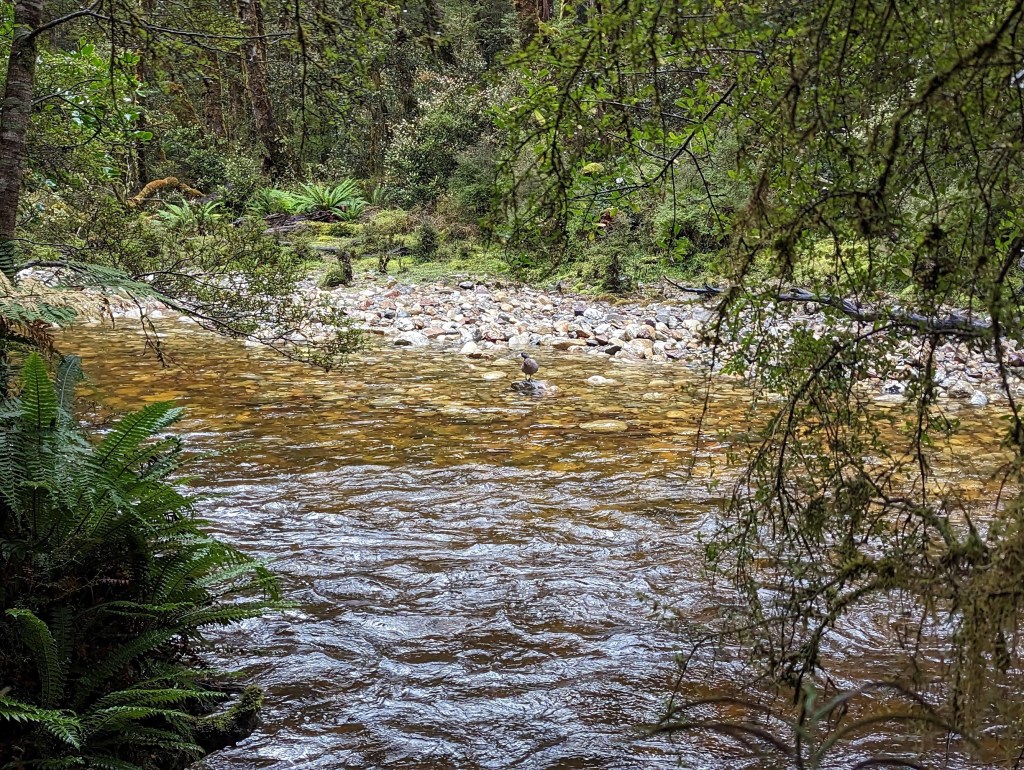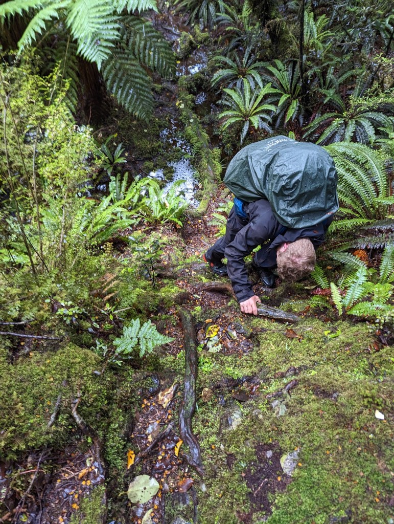 We immediately see the passage of the DOC team. They cleared the ferns along the trail. This makes this very flat first section all the easier. We have a good rhythm and our feet still quickly get wet 😅. Barely a few hundred meters away, we see out of the corner of our eyes a deer scurrying through the forest. Then very soon after, it’s a Kereru that flies away next to us! We also suddenly come across a small group of three hunters, a father and his two sons. They also go to the same hut as us but taking more time because they are trying to shoot a deer.