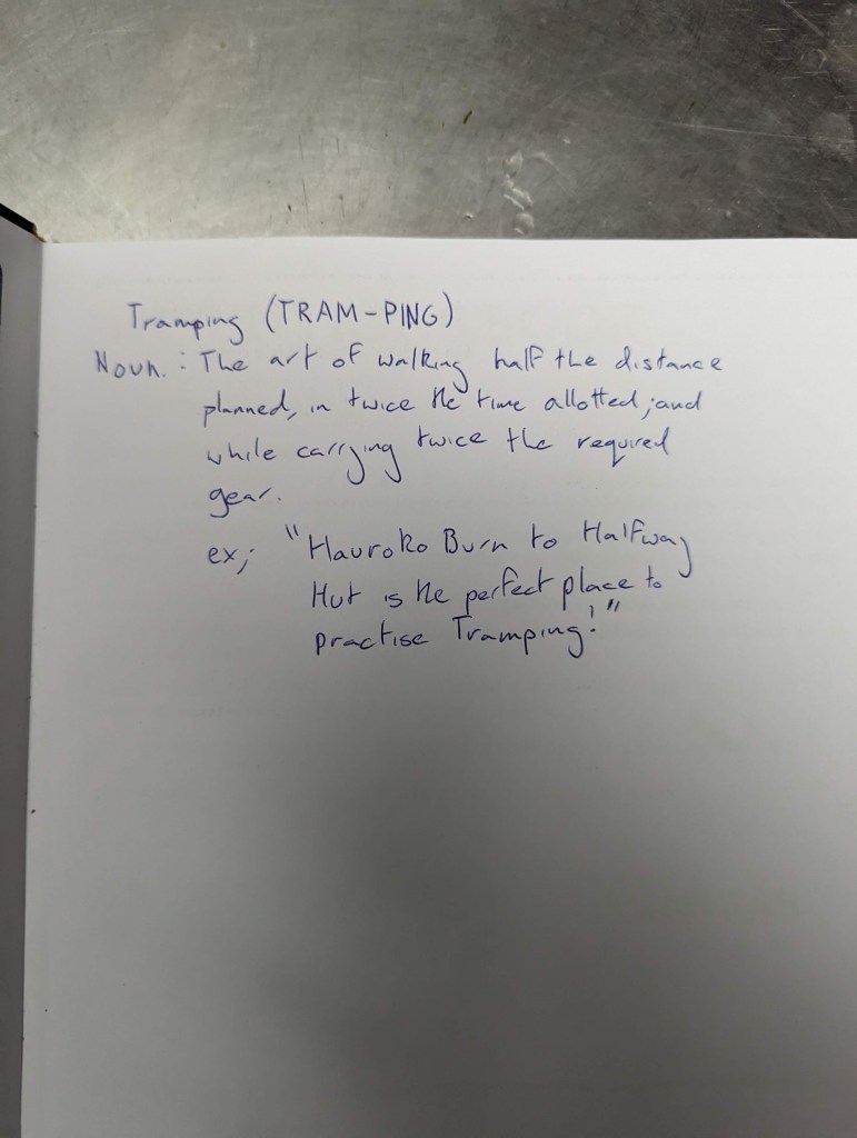 Avec en plus de ça la pluie et les fougères couvertes d’eau, on est trempés jusqu’aux os. Mais heureusement, on arrive enfin à notre première hut de la semaine, Halfway Hut. Halfway entre quoi et quoi ? Bonne question. En tout cas c’est clairement pas déjà le milieu de notre aventure. Qu’à cela ne tienne, on se dépêche de nous mettre à l’abri pour enfiler nos vêtements secs et allumer un bon feu pour faire sécher le reste.