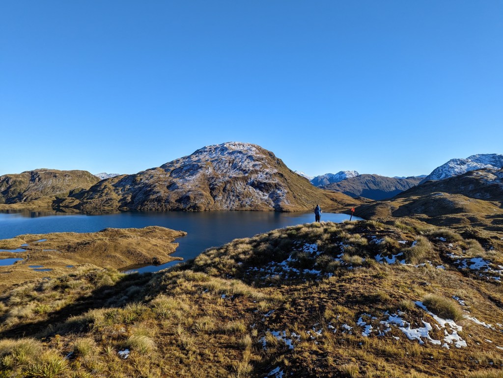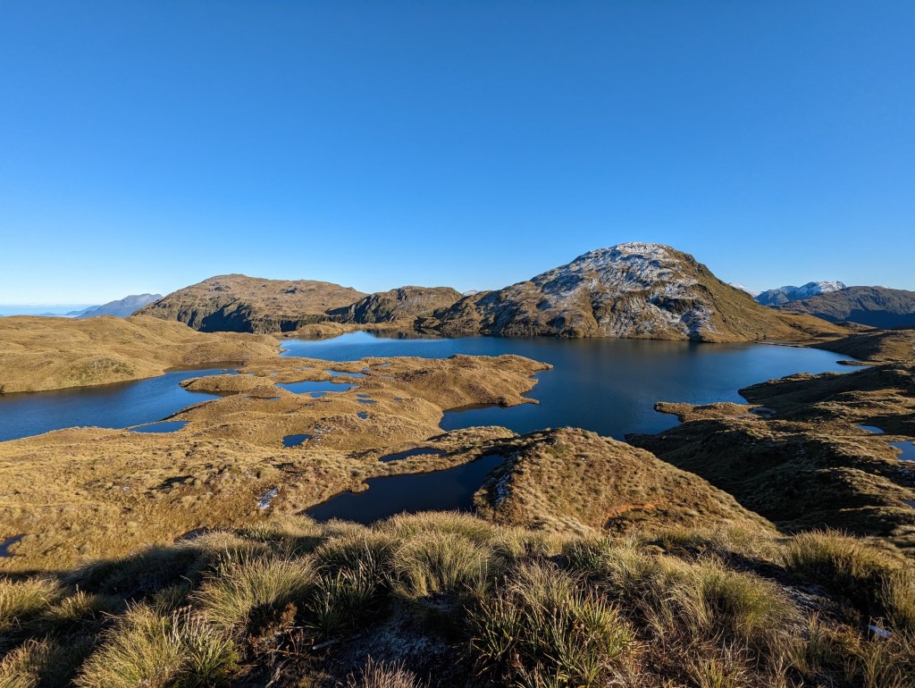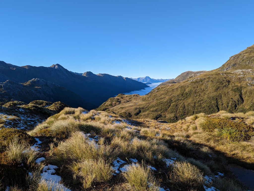 Après un kilomètre et environ 150m de dénivelé, nous atteignons un point de vue magnifique sur deux lacs, Lake Ursula et Lake Horizon, ainsi que sur la petit chaîne montagneuse prénommée Pleasant Range. De là, on peut aussi voir Hauroko Burn Valley d’où nous venons, transformée en lac de nuages.