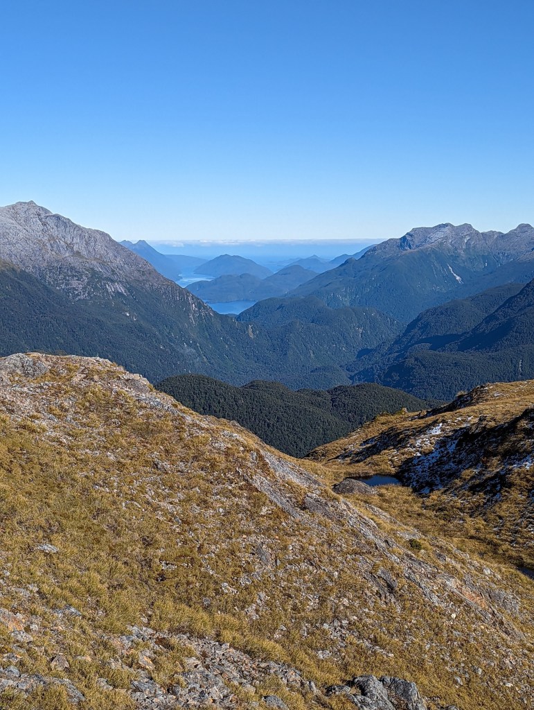 Le sentier nous fait ensuite passer entre les deux lacs puis nous fait grimper encore jusqu’à un sommet sans nom duquel nous avons le plaisir et la chance fabuleuse de pouvoir voir le Dusky Sound dans son ensemble. On distingue clairement les deux îles, Cooper Island et Long Island, qu’il contient mais aussi l’océan plus loin loin en arrière plan. De ce point de vue, il nous est aussi possible d’admirer un panorama sur toutes montagnes environnantes ainsi que la vallée dans laquelle nous allons marcher demain.