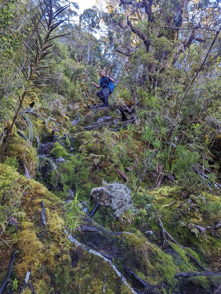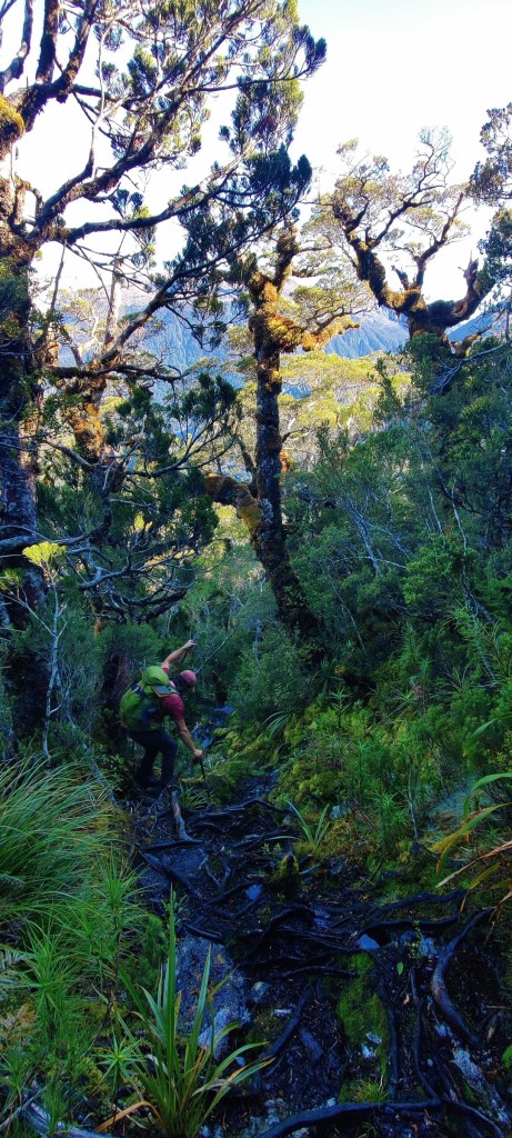 Et oh mon dieu quelle descente… 900m de dénivelé en à peine plus d’un kilomètre et demi. Le début est encore gentil avec quelques dernières vues avant de replonger dans la forêt. Et c’est là que les choses sérieuses commencent. Le sentier est extrêmement raide et zigzague entre les arbres aux racines apparentes. Ces dernières sont constamment humides et par conséquent très glissantes. On est vraiment bien content d’avoir nos bâtons de marche pour amortir le choc de nos pas sur des marches parfois particulièrement hautes.