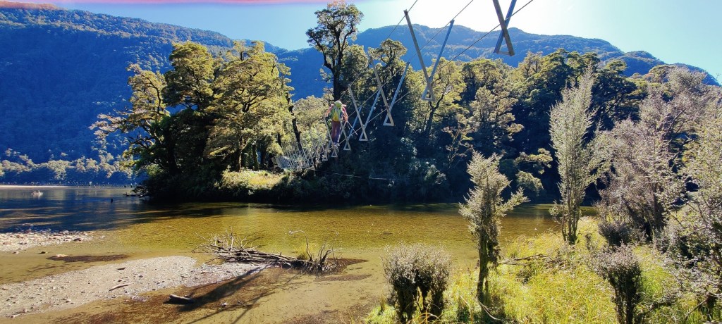 Cette descente semble interminable et nos genoux commence sérieusement à faire connaître leur mécontentement. Mais heureusement, par force de persévérance, nous atteignons enfin le fond de la vallée. On boitille un peu sur ce chemin délicieusement plat jusqu’à atteindre une large rivière peu profonde au travers et par dessus laquelle passe un long pont de câbles. C’est certainement le plus long qu’on ait emprunté de tout notre séjour en NZ (TA compris). Sur un moment de faiblesse, un pied de Gijs glisse et il s’envoie un genou dans le câble mais heureusement tient bon. Ça va faire un joli bleu. On est bien éclatés.
