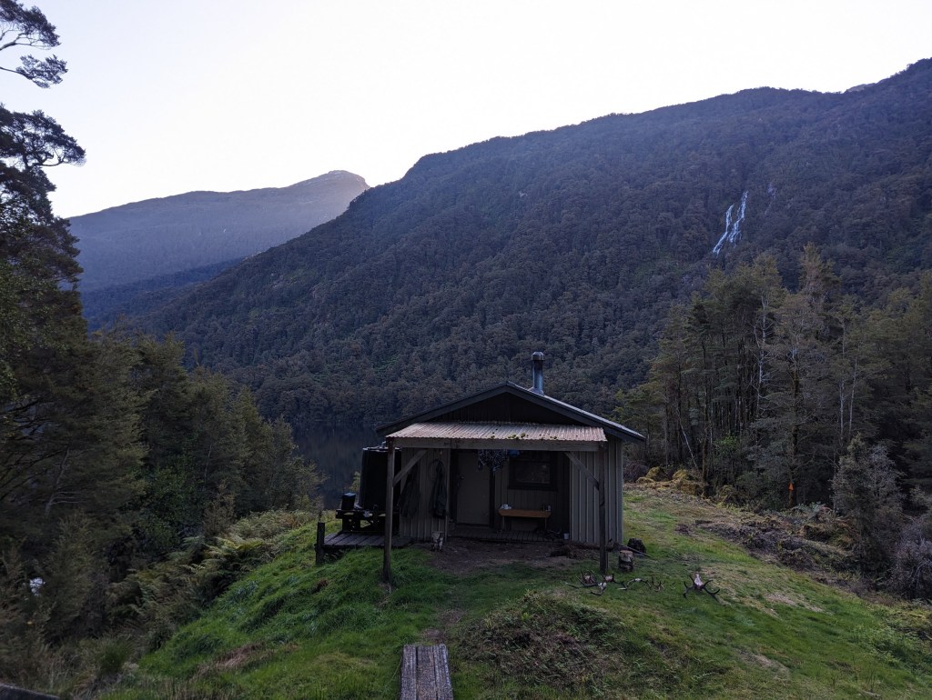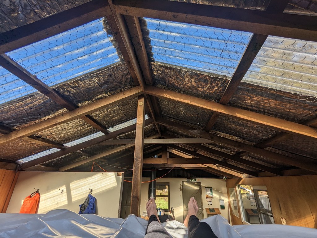 On entre alors pour s’installer et pour faire connaissance. Ce sont deux kiwis qui sont là déjà depuis le 31 mars pour 10 jours. On discute brièvement pendant qu’on mange notre lunch avant d’imiter nos colocataires en allant faire la sieste sur nos lits. Vers 17:00 ils s’activent et s’en vont chasser…
