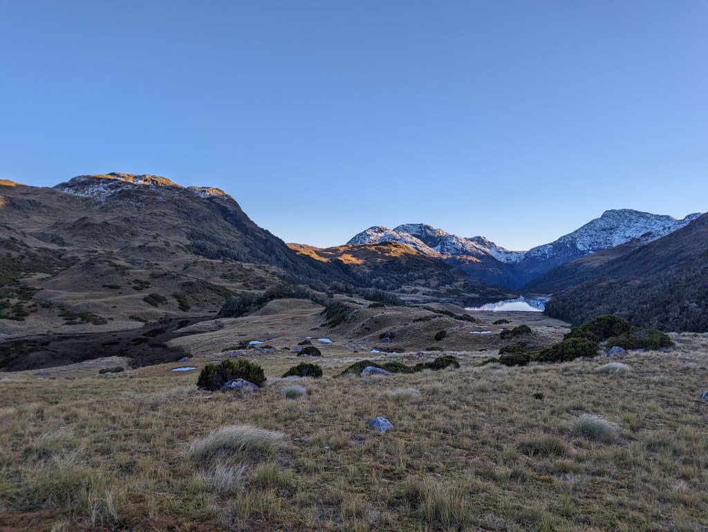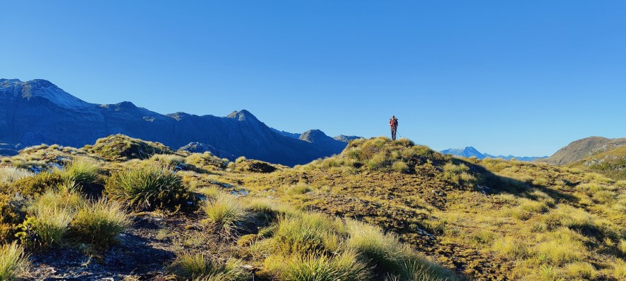 On se met ainsi en route vers 8:25 encore à l’ombre de la montagne sur laquelle est adossée la hut. On doit à nouveau passer par l’étendue plate et marécageuse avant de pouvoir nous lancer dans une première montée partiellement ensoleillée. On essaie tant bien que mal de garder nos pieds secs mais un peu d’eau glaciale de glisse inévitablement dans nos chaussures. Délicieux.