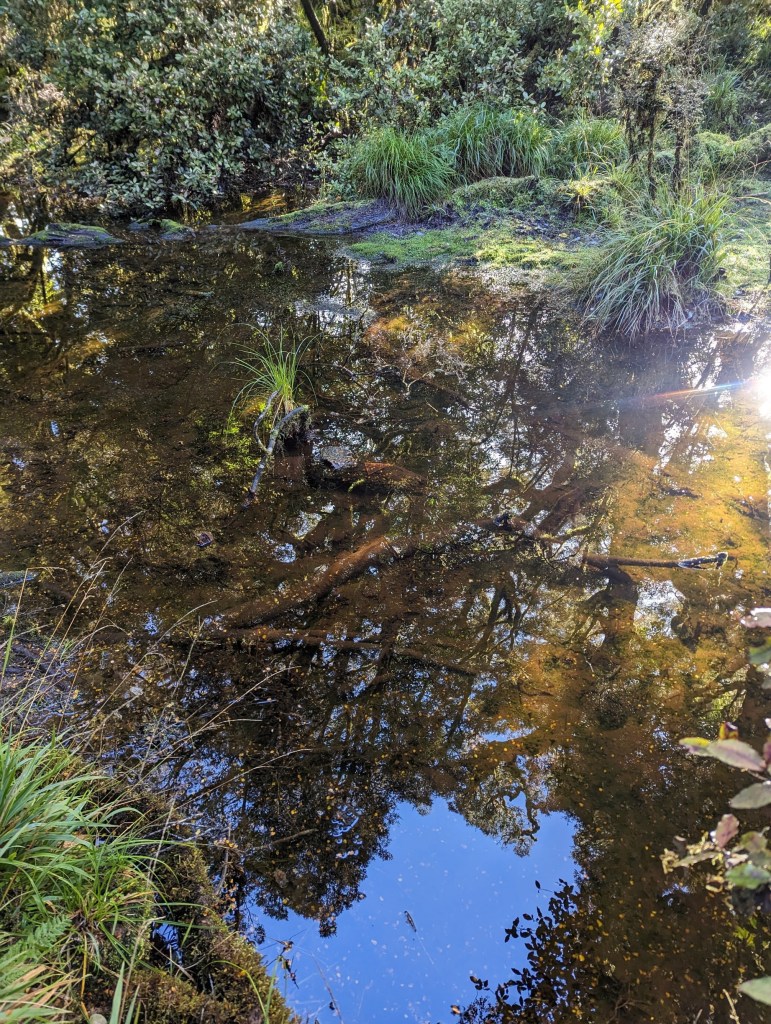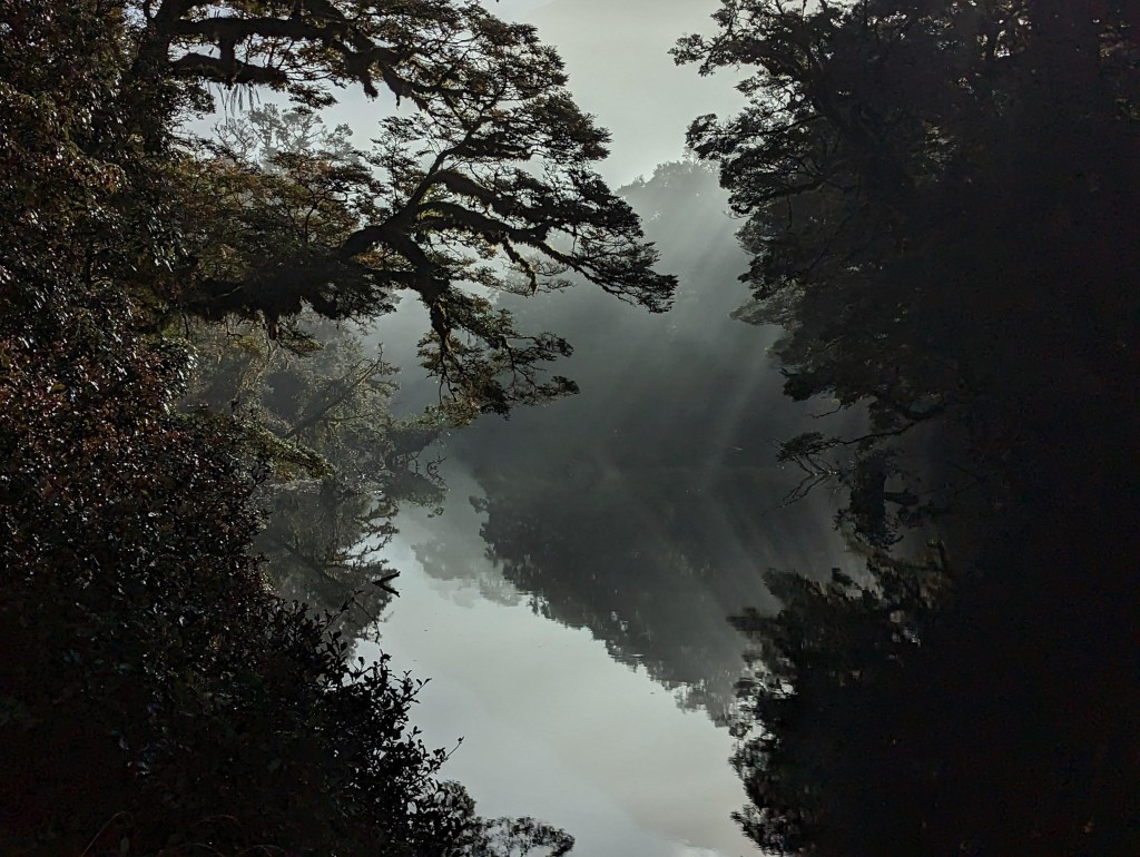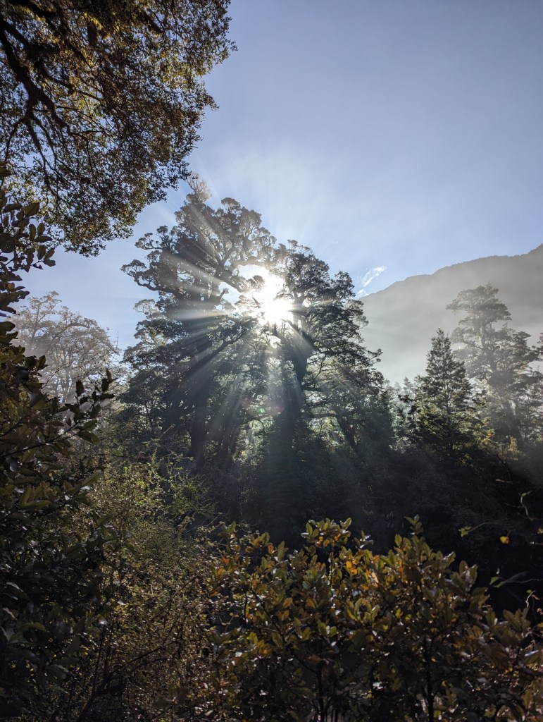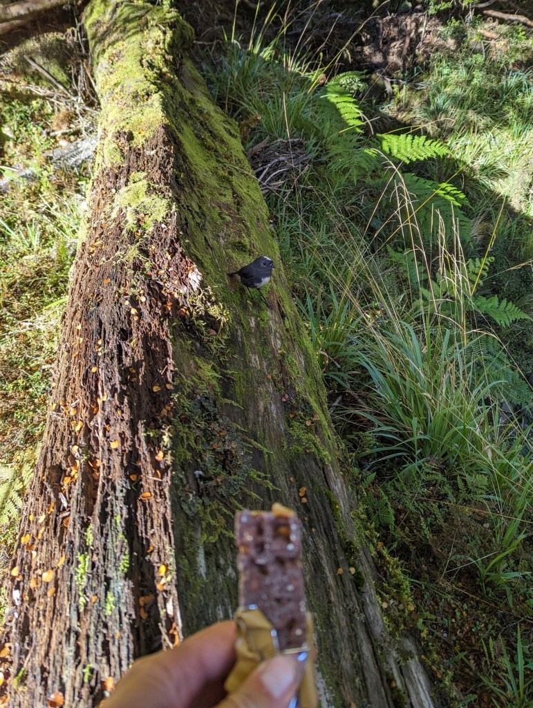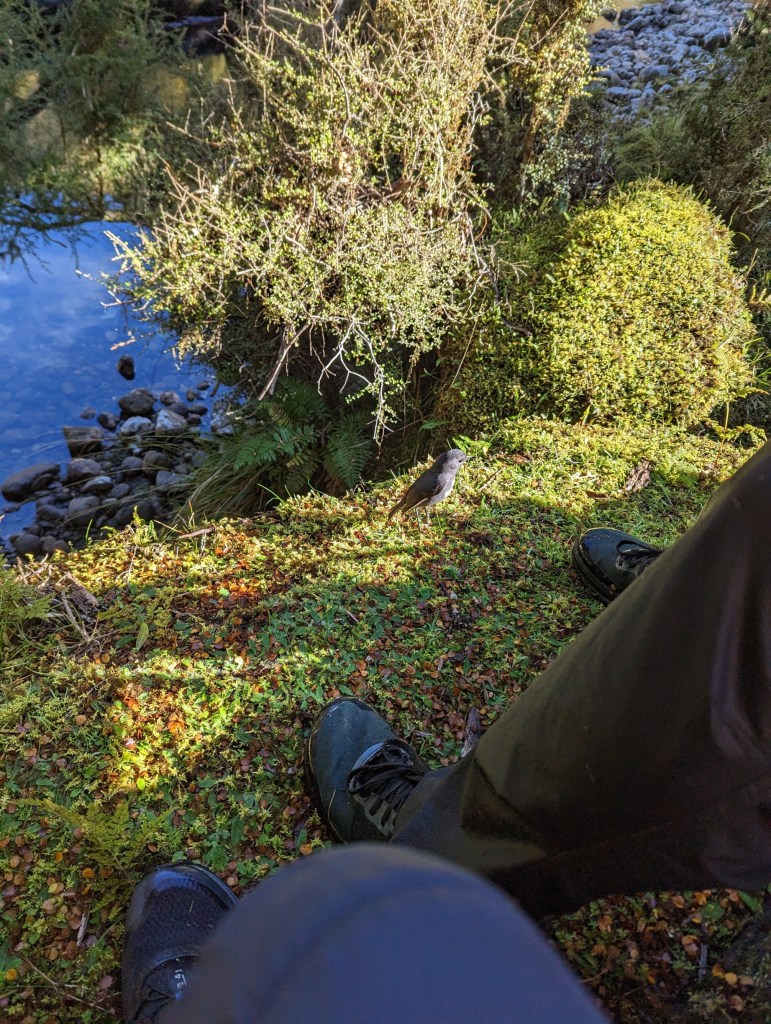 Pour ajouter un peu de magie à l’ambiance, on peut entendre au loin de l’autre côté de la rivière quelques brames de cerfs. On est aussi fréquemment accompagnés par d’adorables Grey Robins qui viennent sautiller devant nous. On voit aussi à nouveau un kereru dans un arbre !