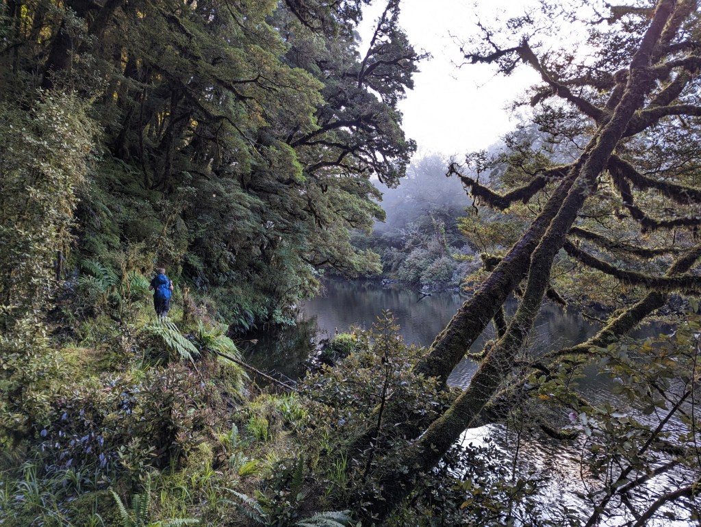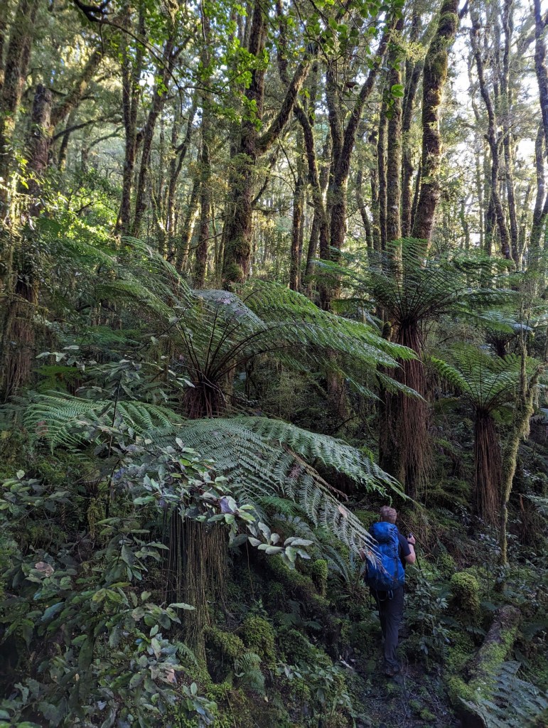 Malgré tout ça, on quitte la hut vers 8:35. Et tout de suite on est dans la jungle verdoyante. Notre tracé du jour nous fait remonter la Seaforth River en la longeant de près et très vite on voit à quel point le beau temps nous facilite la tâche. En effet, à pas mal d’endroits le sentier est à raz de la rivière et il suffirait d’une bonne pluie diluvienne pour qu’elle le recouvre. Mais aujourd’hui, c’est loin d’être le cas et on peut très facilement se déplacer.
