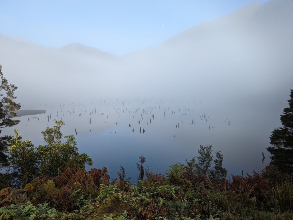 Il fait toujours aussi frais le matin mais également toujours aussi beau. Il y a un épais brouillard mais on arrive quand même à deviner le bleu du ciel derrière tout ça. Ça devrait se dégager avec l’arrivée du soleil.