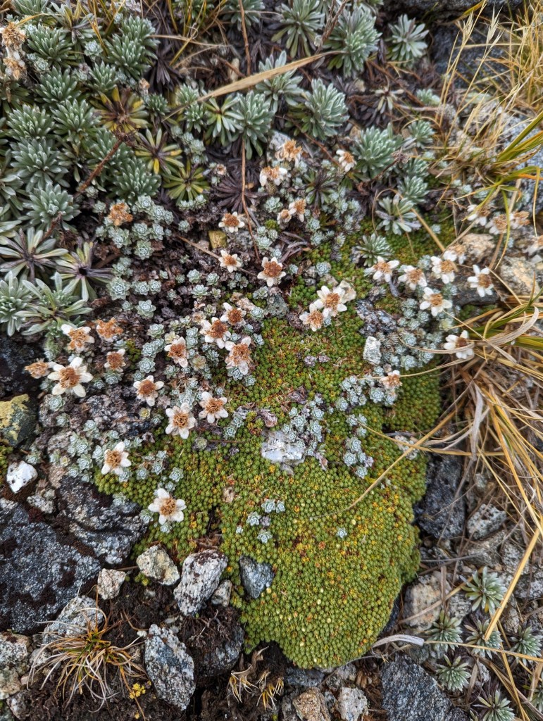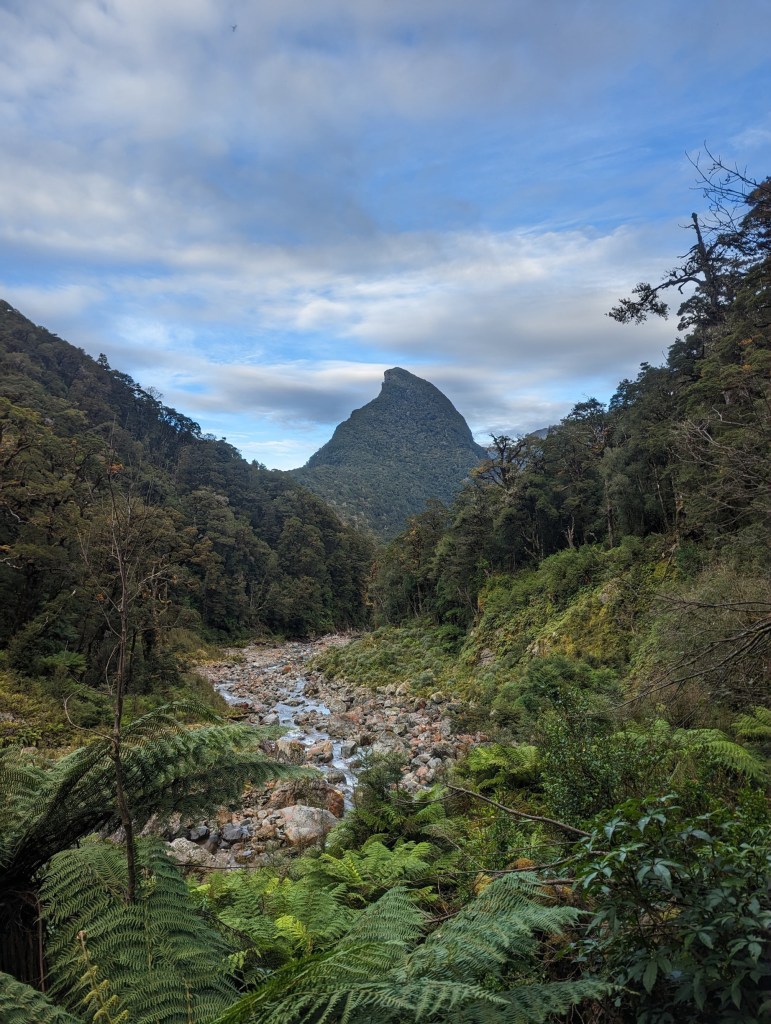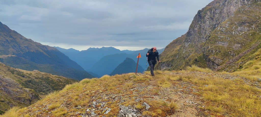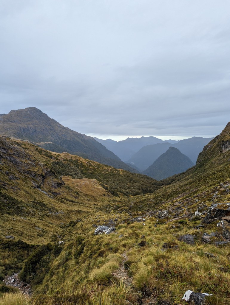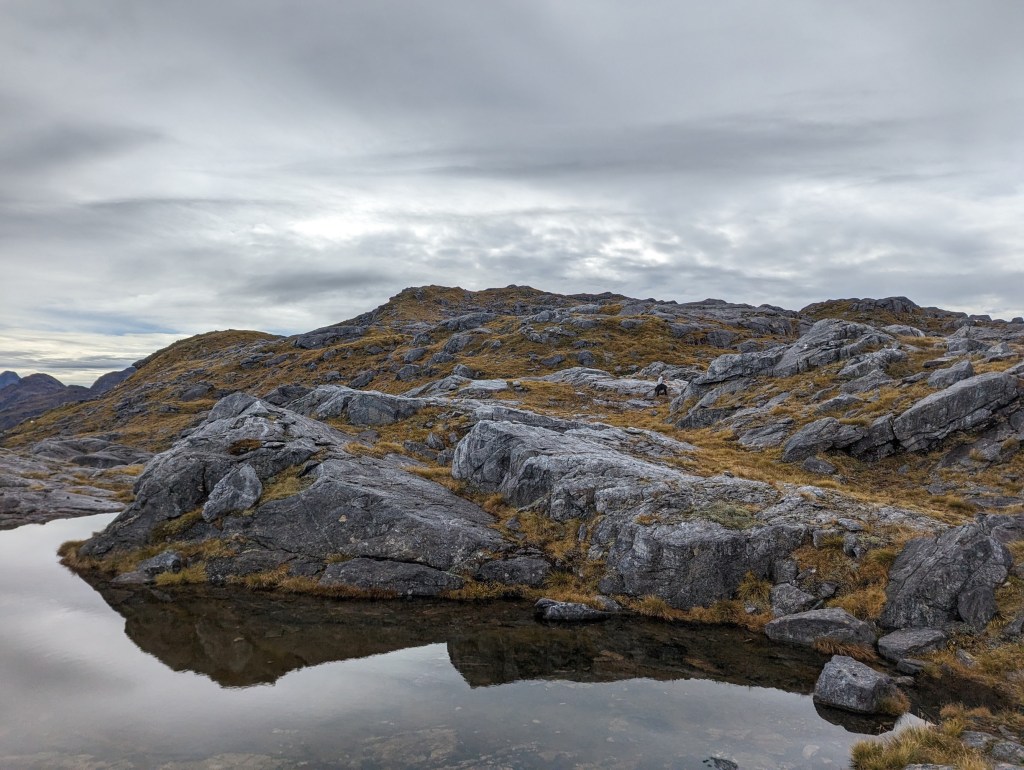 Une fois au fond de la vallée, le terrain devient marécageux et on met à nouveau à profit nos talents d’équilibristes pour éviter les flaques les plus profondes (parfois nos bâtons s’enfoncent de 30 à 40cm, on remercie alors le ciel que c’était pas un de nos pieds à la place 😅).