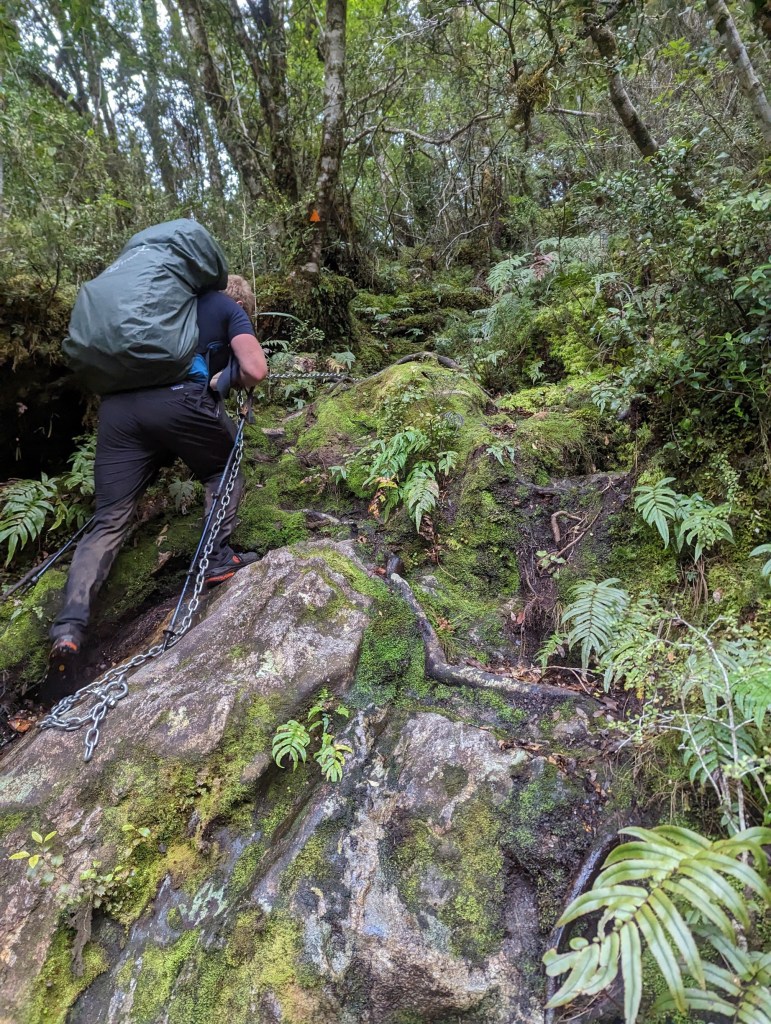 Mais avant tout ça, y va falloir monter. Et ça va monter sec. Très vite après la hut, notre sentier nous fait grimper… Grimper… Grimper ! Environ 650m de dénivelé sur 1.5km. Ça pique ! Une partie est facilement à 40-45°.