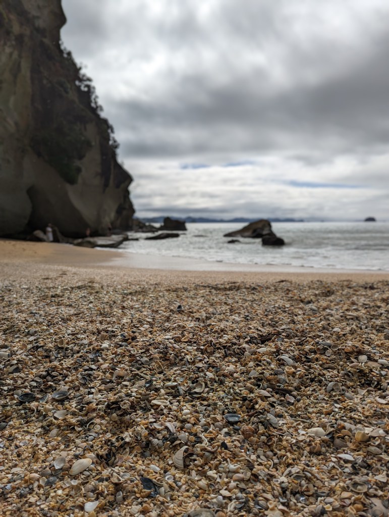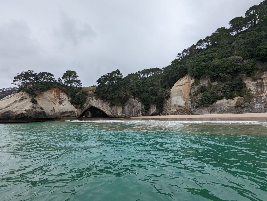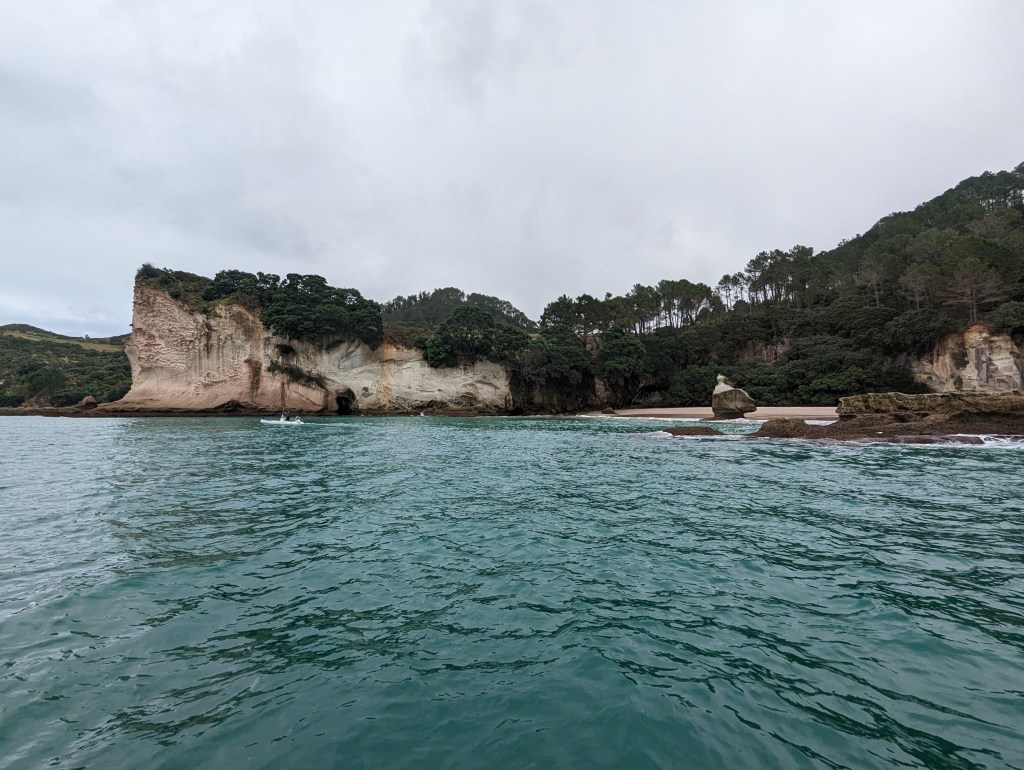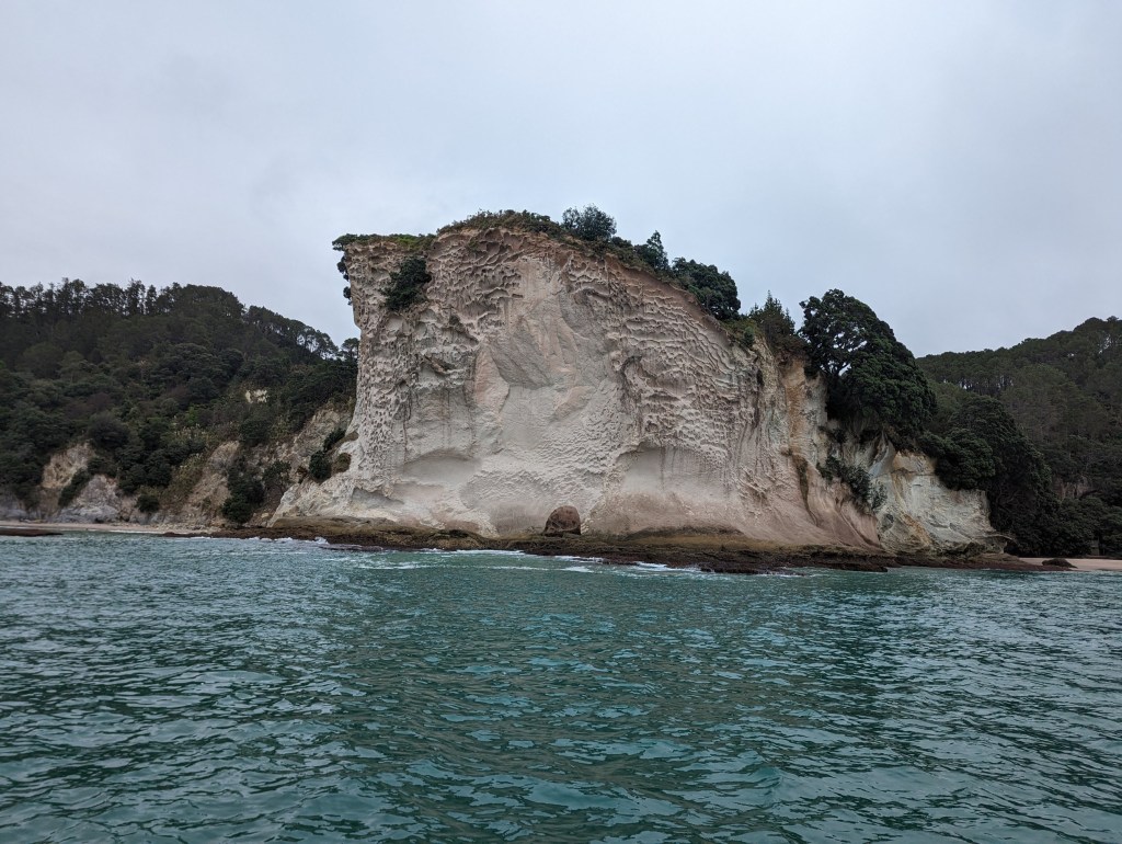 Puis, enfin, nous arrivons vers Cathedral Cove! Et c’est très impressionnant ! Une énorme arche sous laquelle il est en principe possible de marcher à marée basse mais pour nous, aujourd’hui, on ne la verra que de loin.