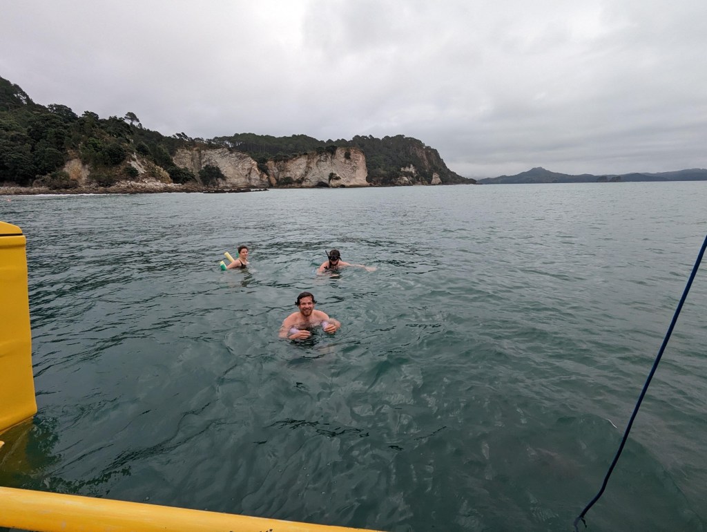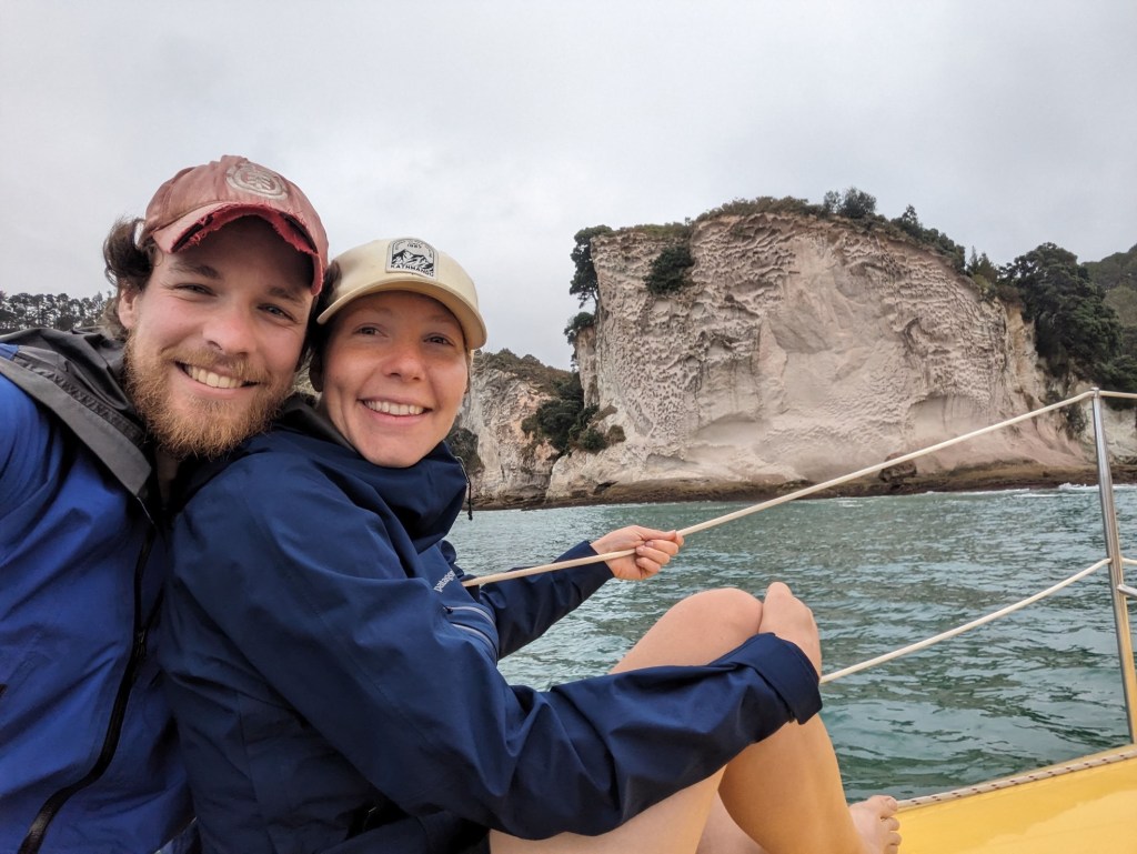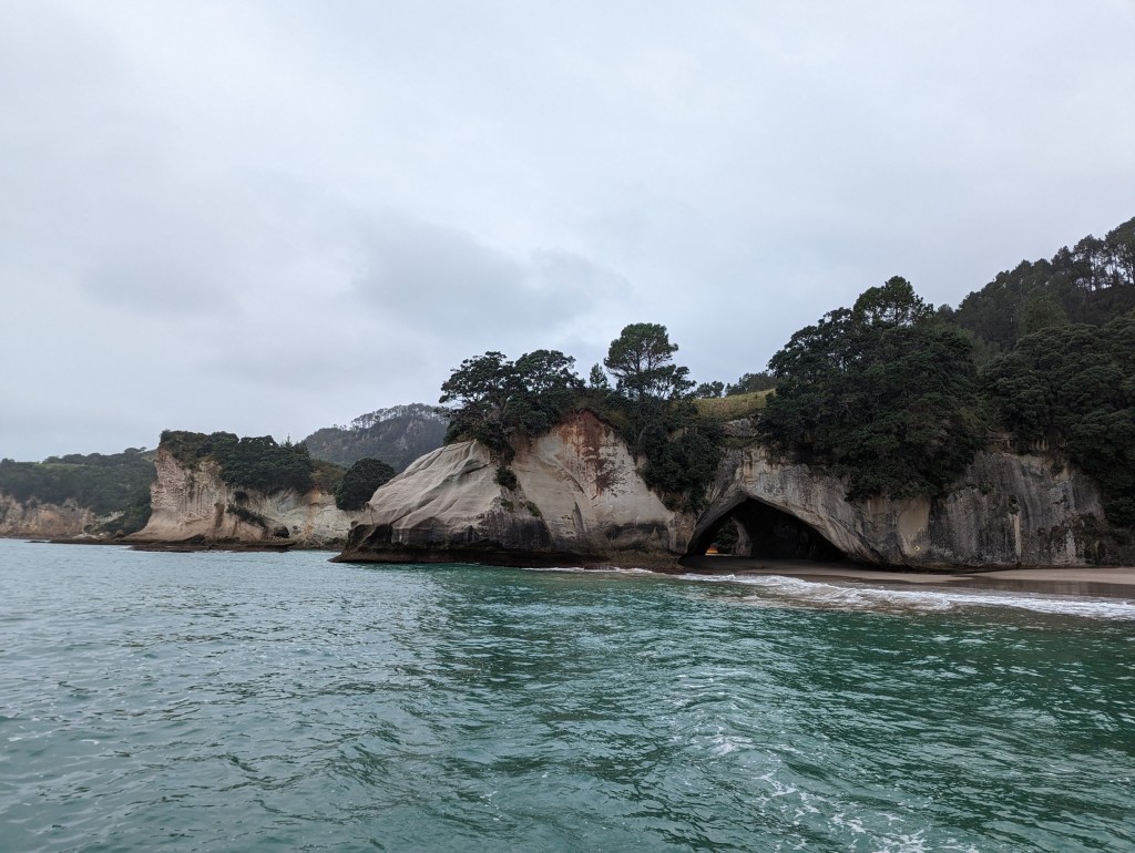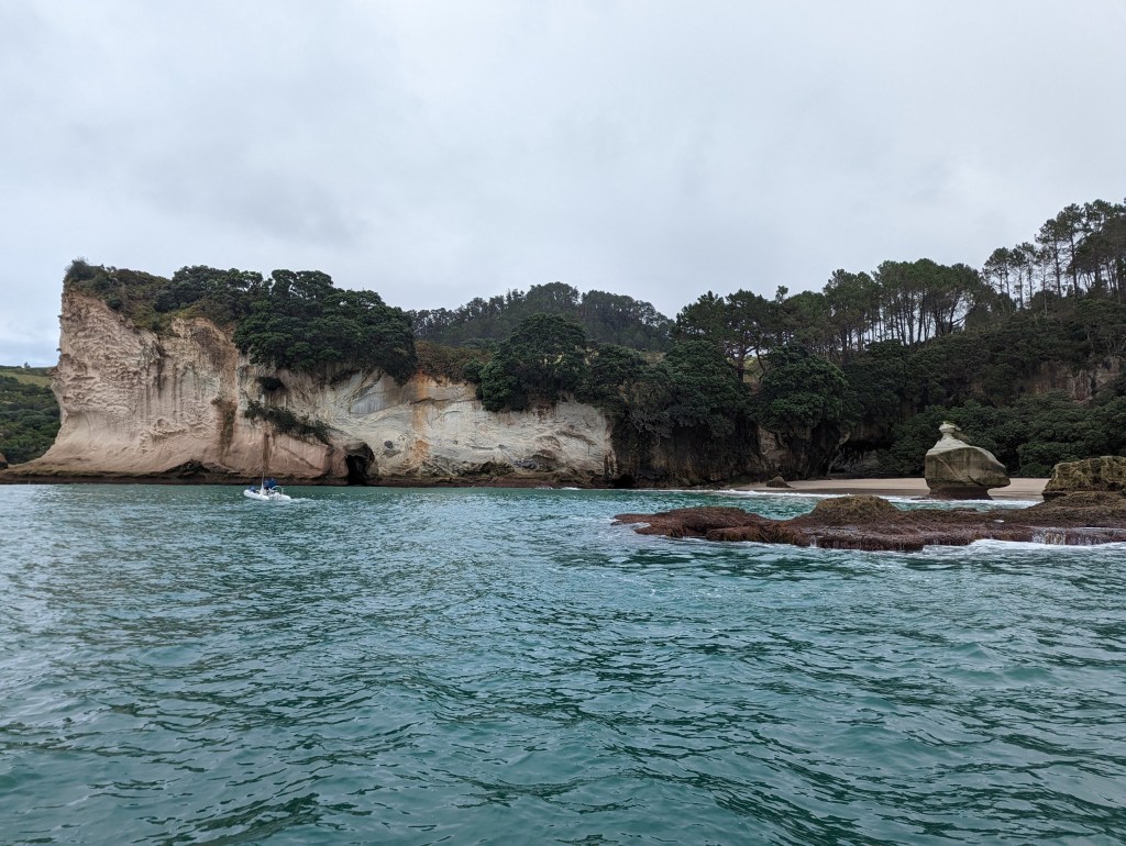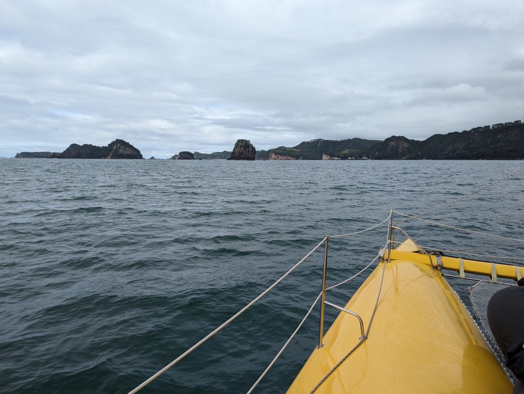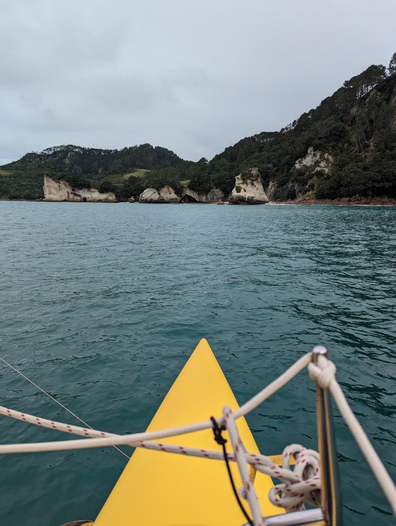 Pour aujourd’hui, on s’est organisé une sortie voile sur un catamaran pour aller voir Cathedral Cove. Non seulement pour profiter du bon vent néo-zélandais mais aussi pour pouvoir tout simplement voir cette grotte ! Eh oui, encore une fois à cause des pluies diluviennes des derniers moi, le chemin d’accès pédestre menant à cette attraction est totalement détruit et Cathedral Cove est donc visible que de la mer.