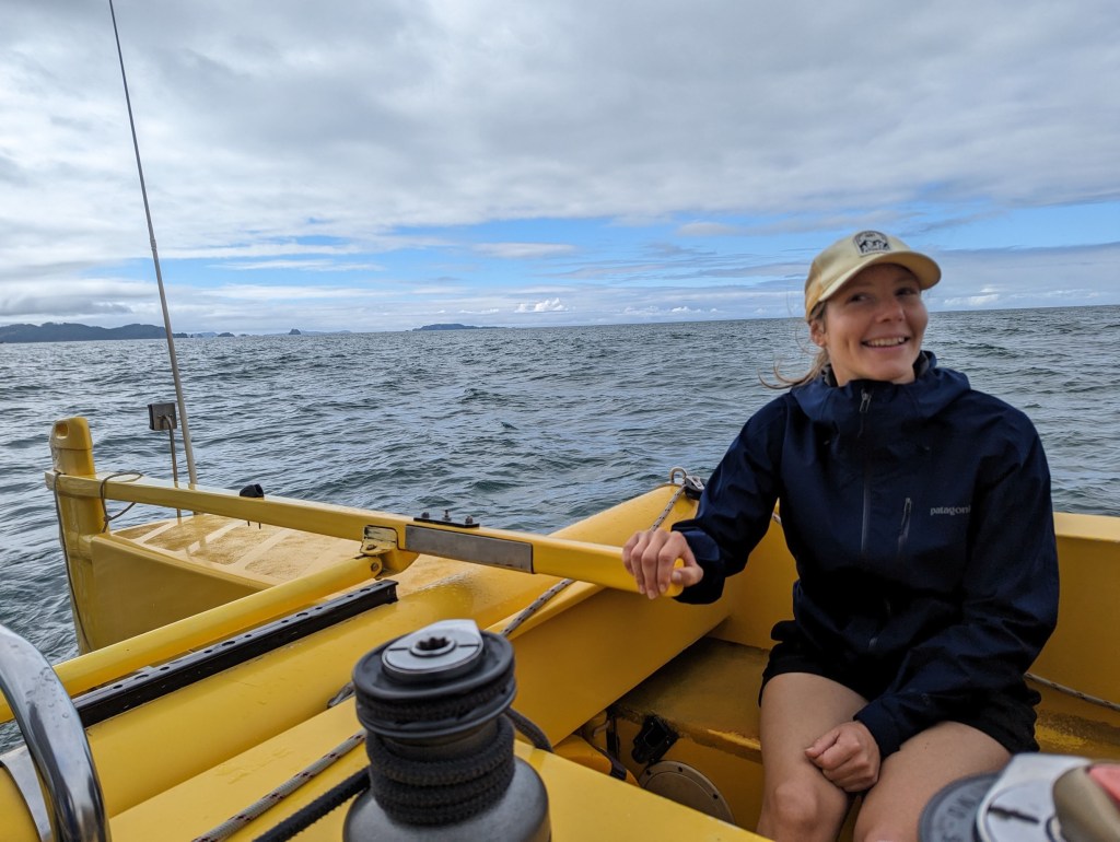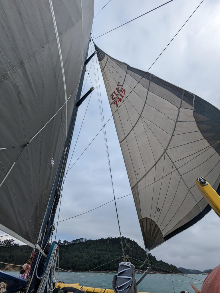 Il n’y a pas beaucoup de vent au début mais une fois au large on peut enfin profiter de naviguer sans moteurs. Ça nous avait manqué 🥲. La croisière est très relaxe et on discute avec quelques passagers et une des skippers. Mag’ prend même la barre pendant un moment.