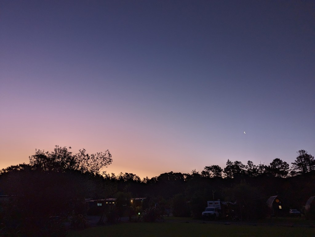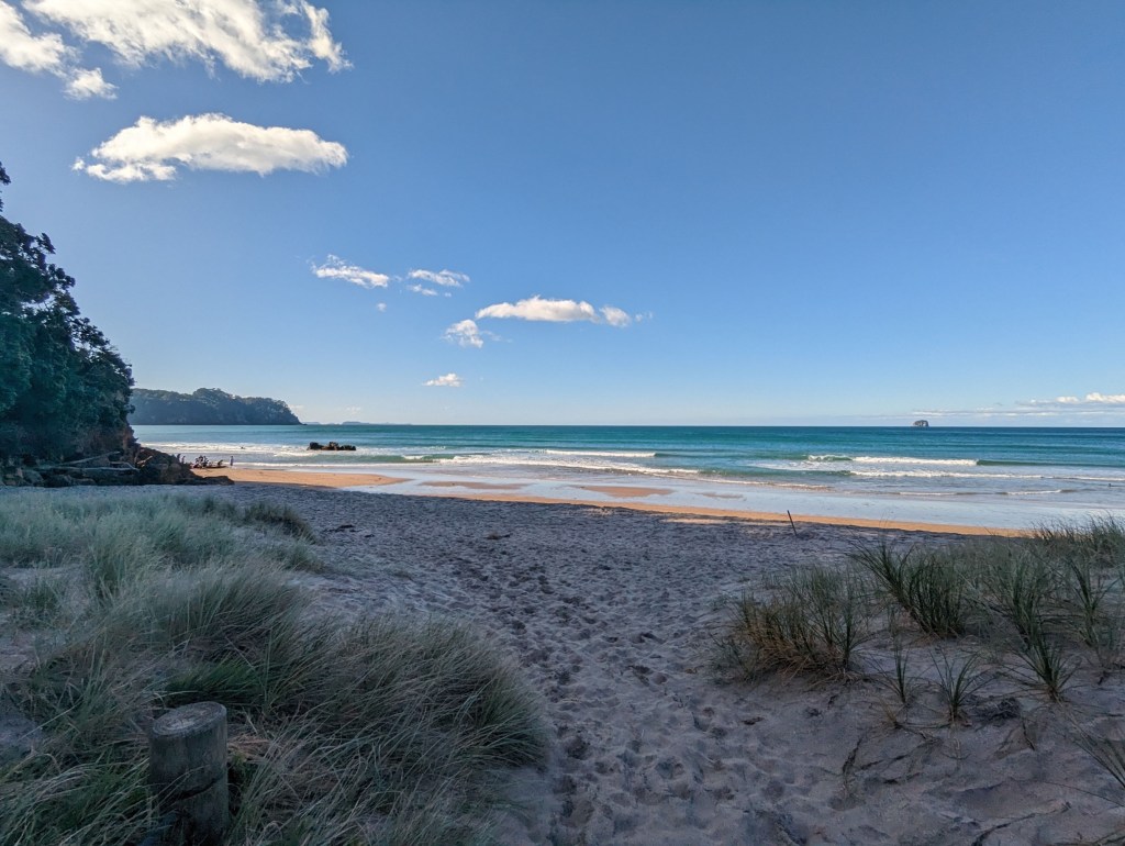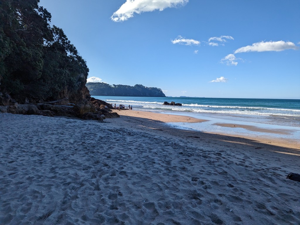 Aujourd’hui, nous allons voir, mais surtout profiter de la Hot Water Beach ! Et pour ça, on a enfin le temps parfait avec un grand ciel dégagé 😄. Il s’avère qu’il y a sur cette plage deux sources d’eau bouillante qui jaillissent du sable (d’où le nom). Par contre, elles ne sont accessibles qu’à marée basse et pour aujourd’hui, elle est à 16:10 (ou à 4:00 du matin mais on est pas motivés à ce point 😅). Étant donné qu’on a loupé la fenêtre de la veille, on décide de rester une nuit de plus sur place pour avoir suffisamment de temps pour bien en profiter.