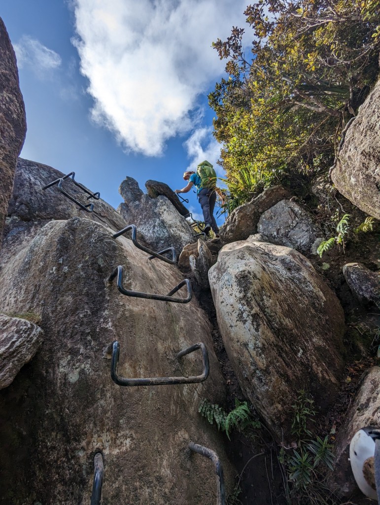 Mais en 3 heures nous atteignons enfin le sommet. La dernière centaine de mètres est particulièrement raide. A un tel point que deux échelles et des barreaux de via ferrata ont été installés. Mais l’effort en vaut la peine car la vue du sommet est magnifique. De là, il y a un panorama à 360 degrés et on peut aussi y apercevoir la côte est de la péninsule.