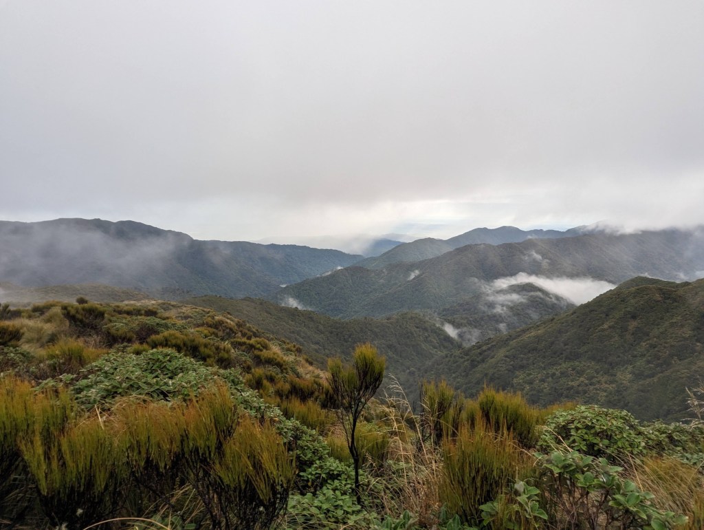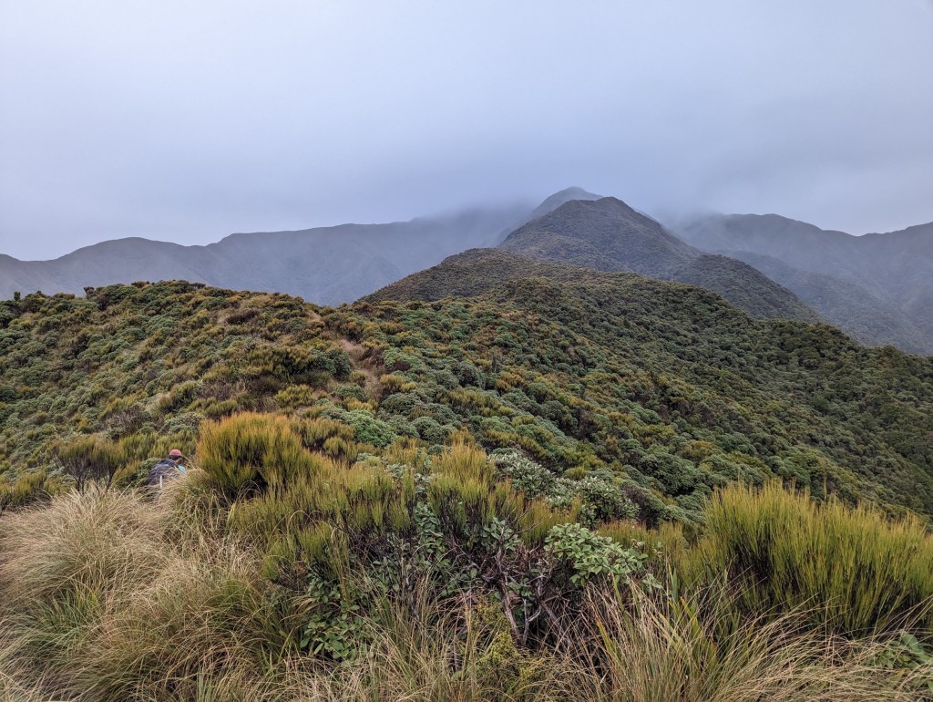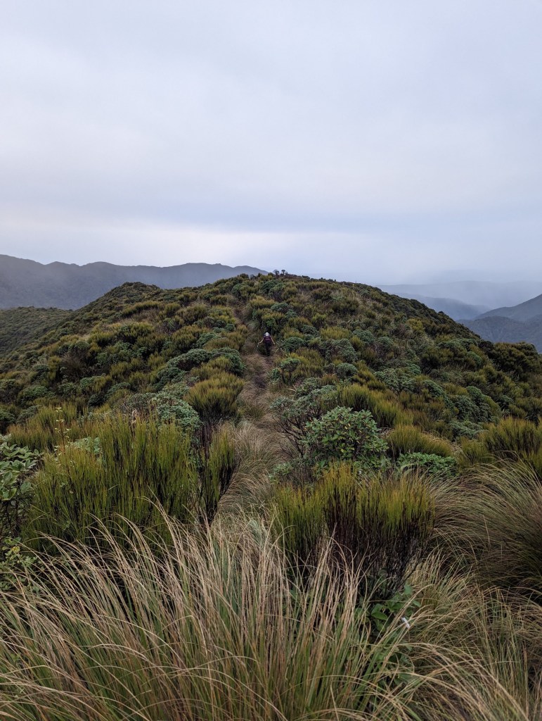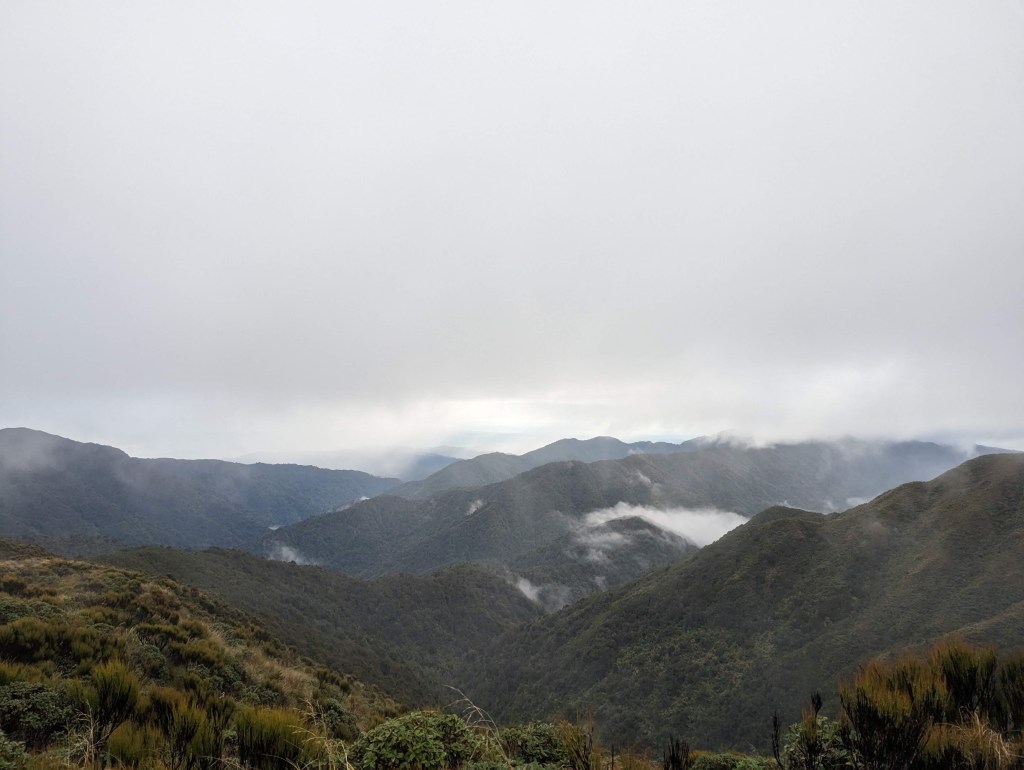 Après un peu plus de 4 heures, on arrive enfin à la première arrête et ainsi à la fin de la montée principale. De là, on suit pendant 1h30 cette arrête avec ses hauts et bas pour arriver vers 12:50 à notre hut du jour : Te Matawai Hut.