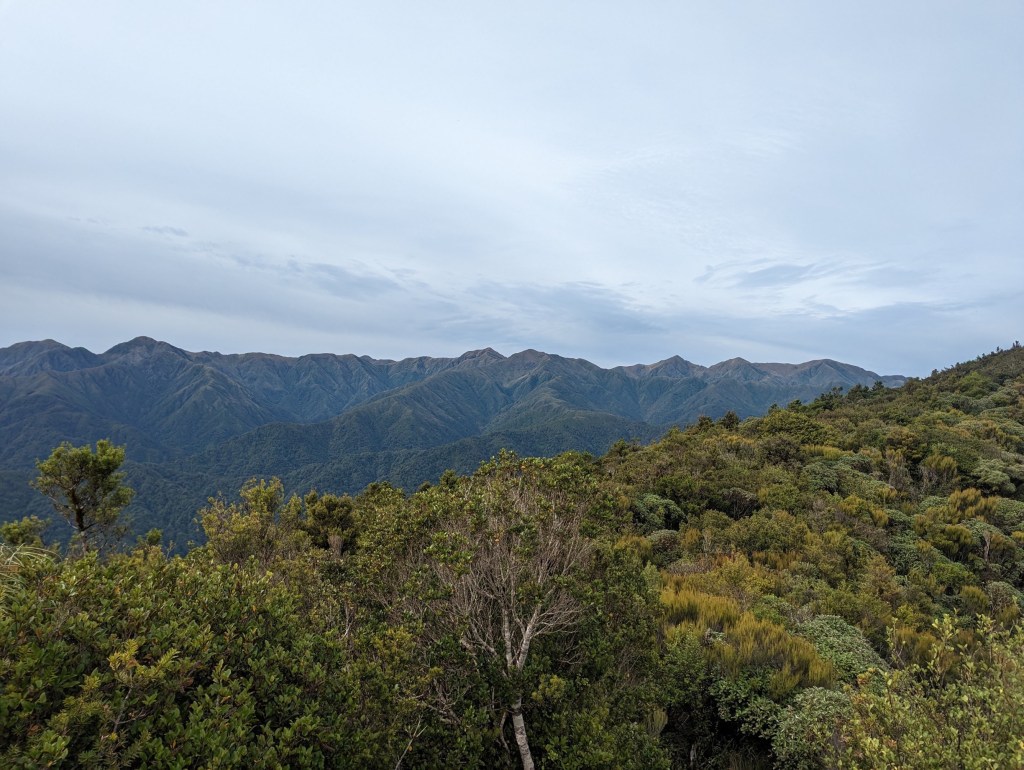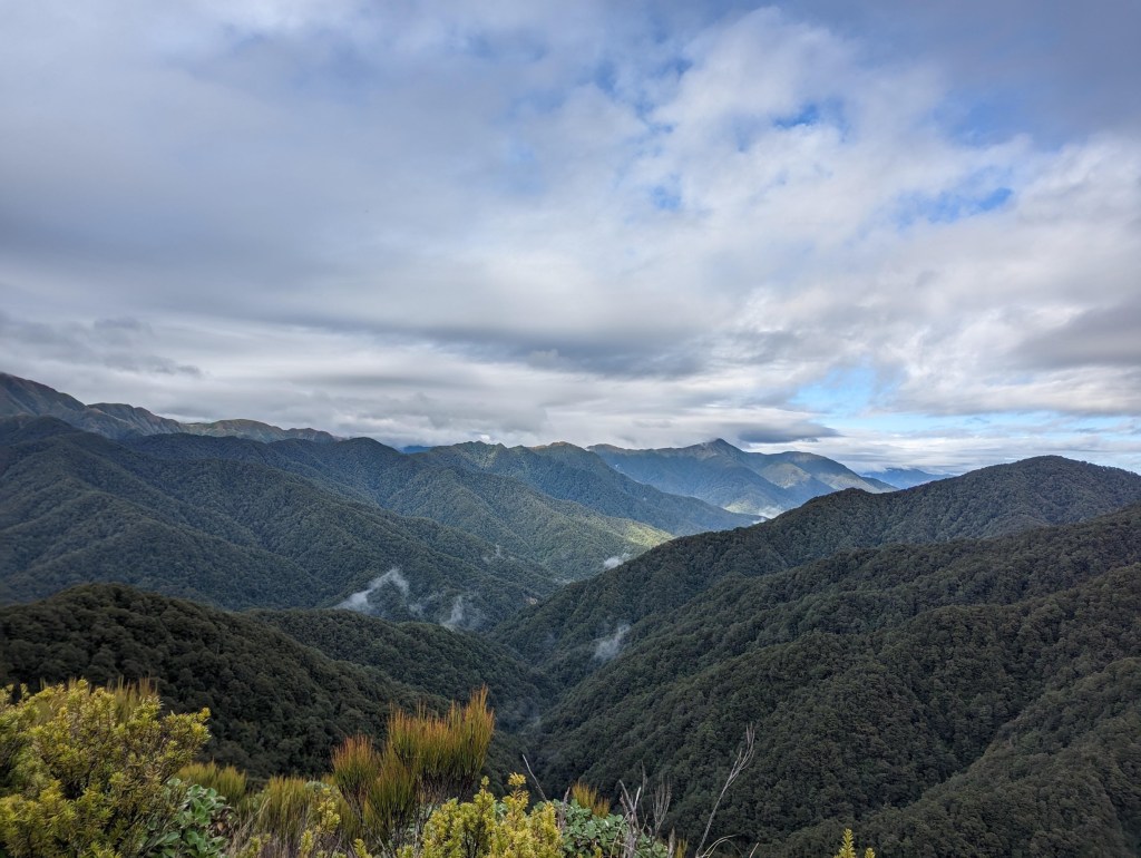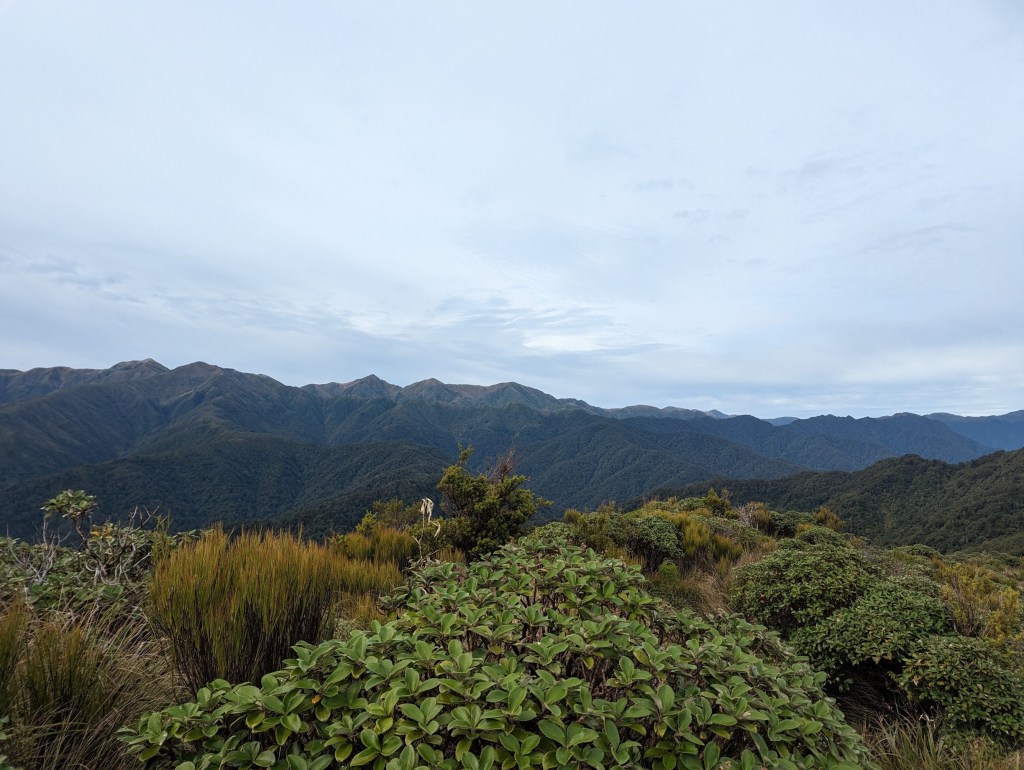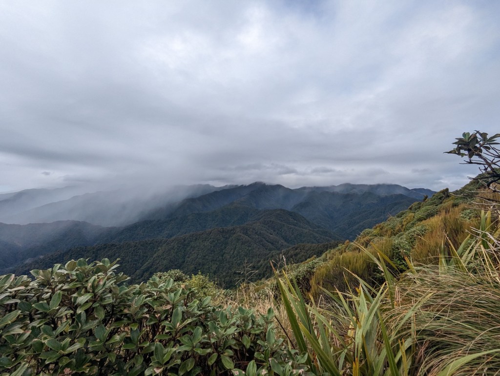 Après un peu plus de 4 heures, on arrive enfin à la première arrête et ainsi à la fin de la montée principale. De là, on suit pendant 1h30 cette arrête avec ses hauts et bas pour arriver vers 12:50 à notre hut du jour : Te Matawai Hut.