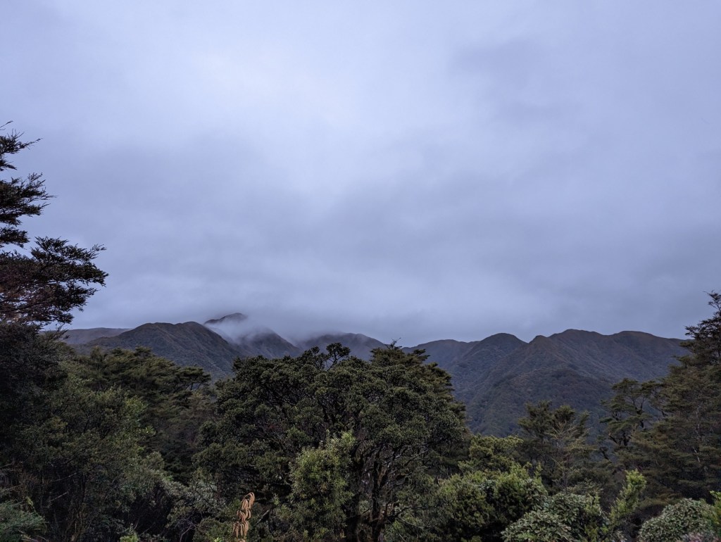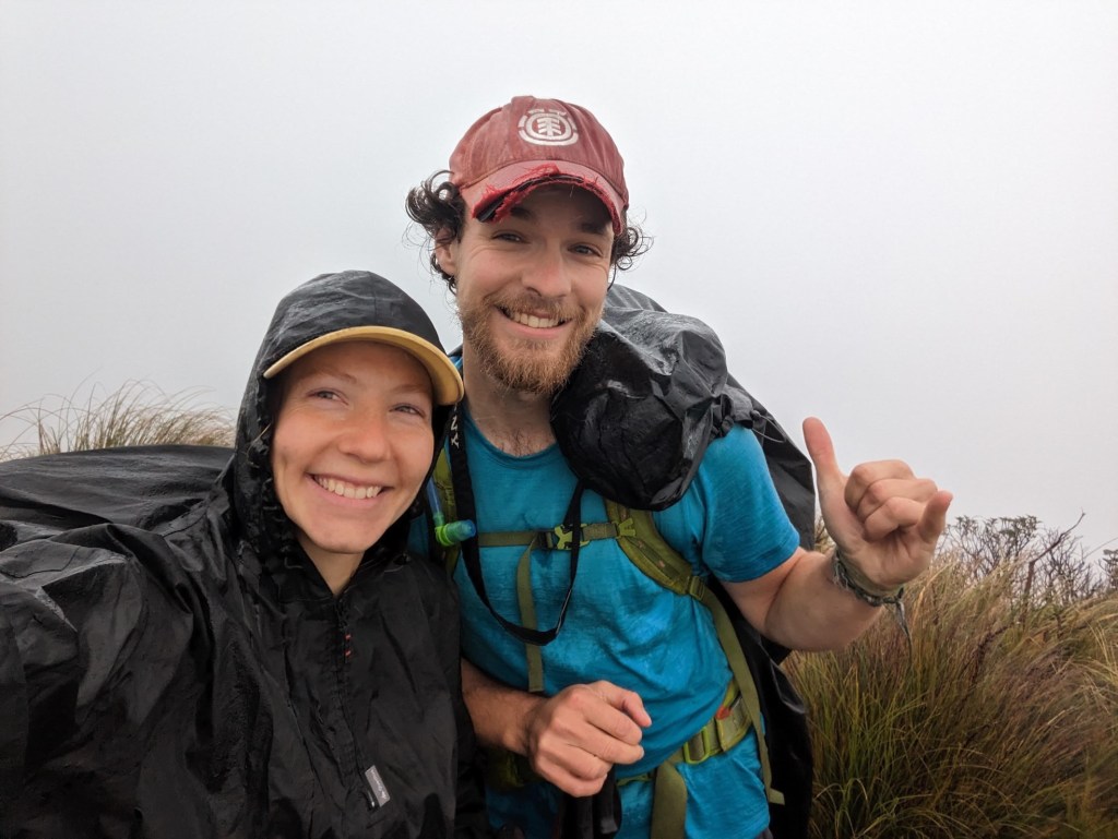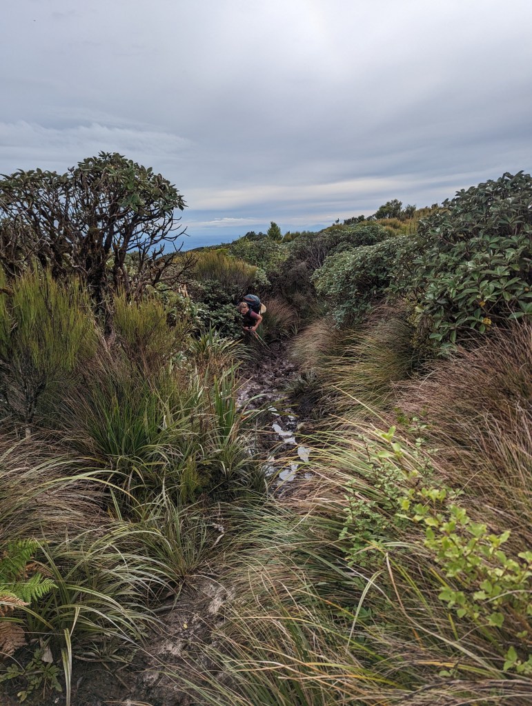 Au matin du deuxième jour… Il pleuvine. C’est pas très bon signe tout ça :/. On quitte quand même la hut à nouveau à l’aube pour profiter au maximum de la lumière du jour. Et très vite nous sommes trempés jusqu’au ventre par les hautes herbes que nous traversons… En plus de ça le vent se lève et le premier sommet par lequel on doit passer est dans les nuages…