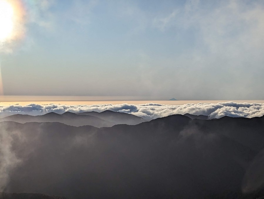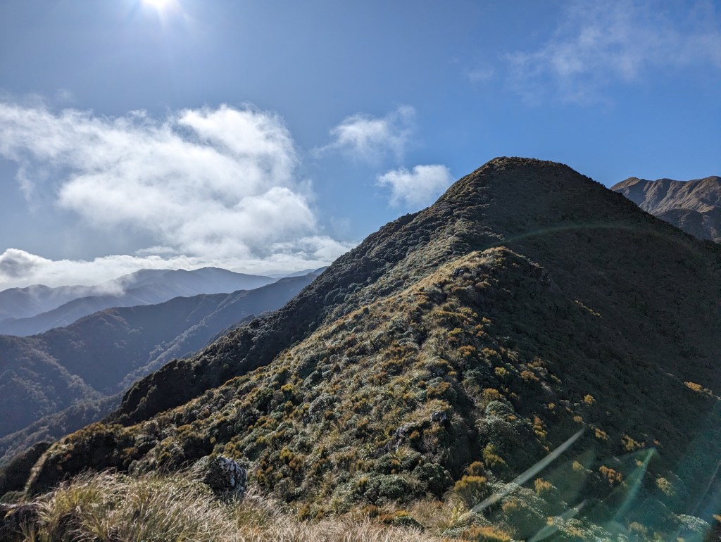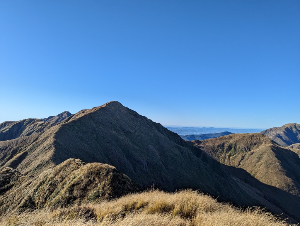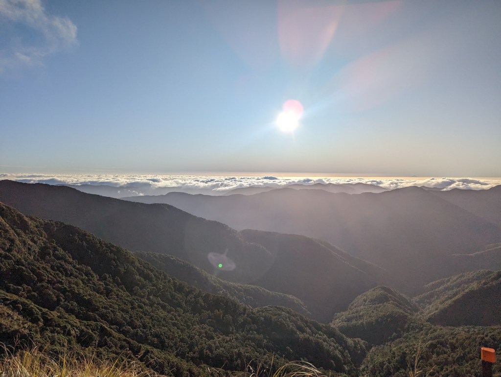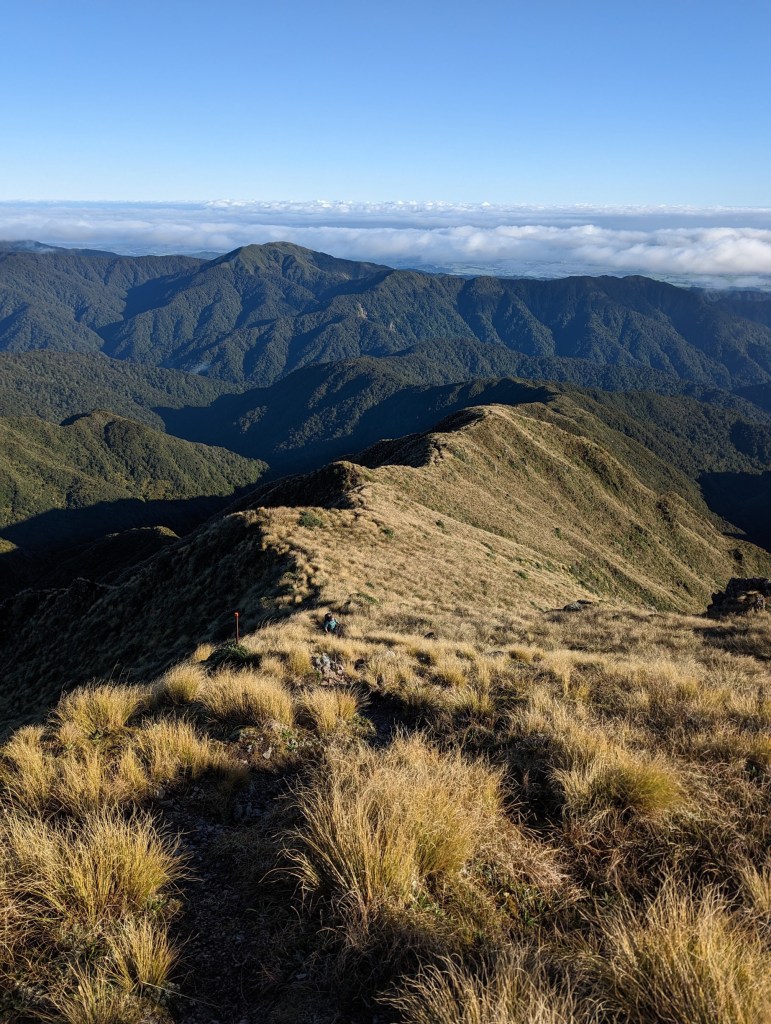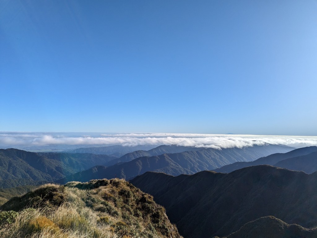 Very quickly, we pass our turning point of last time and in a little less than 2 hours we arrive at the first summit: Pukematawai. From there, the view we have is spectacular. So much so that I suddenly notice in the distance the silhouette… of Mount Taranaki?! Amazing ! Apparently it is quite rare to have the conditions good enough to see it from here. We are very lucky!