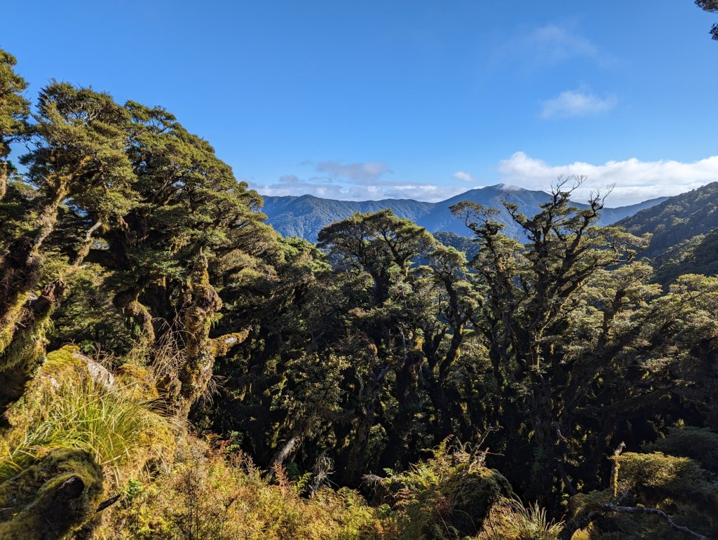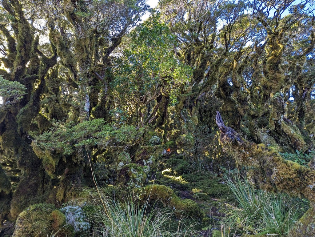 On arrive malgré tout à Dracophyllum Hut un peu avant 13:00, juste à temps pour manger notre lunch. Malheureusement, on remarque très vite qu’il fait plus froid dans la hut que dehors, alors on s’empresse d’aller trouver un coin de soleil parmi les arbres…