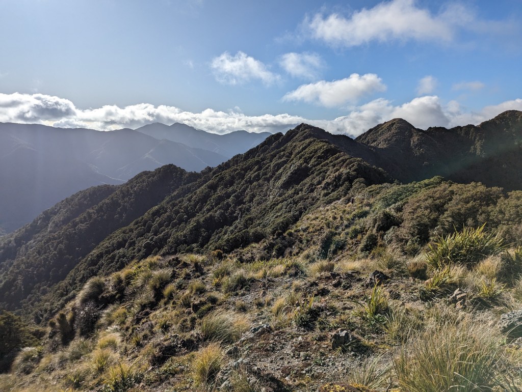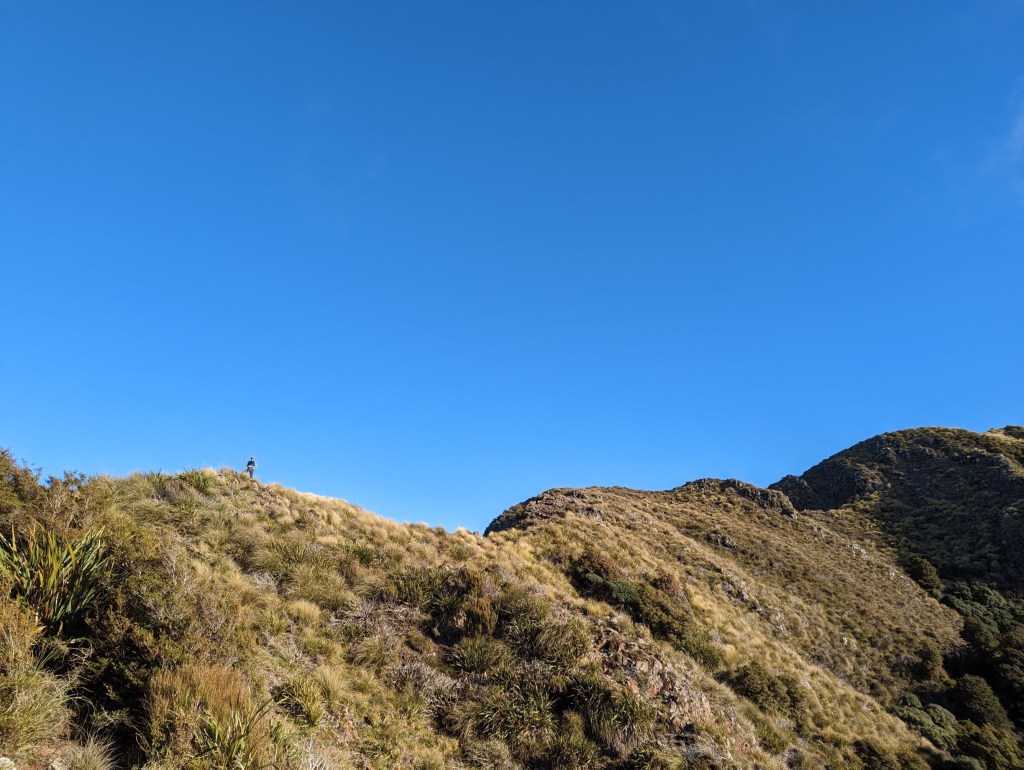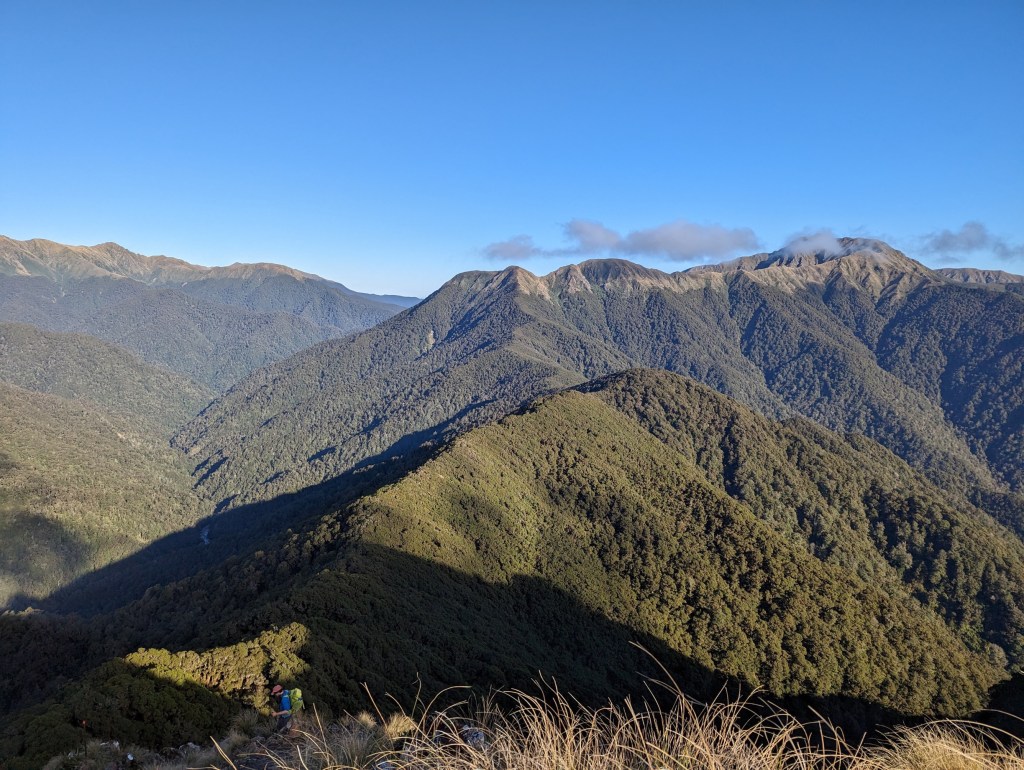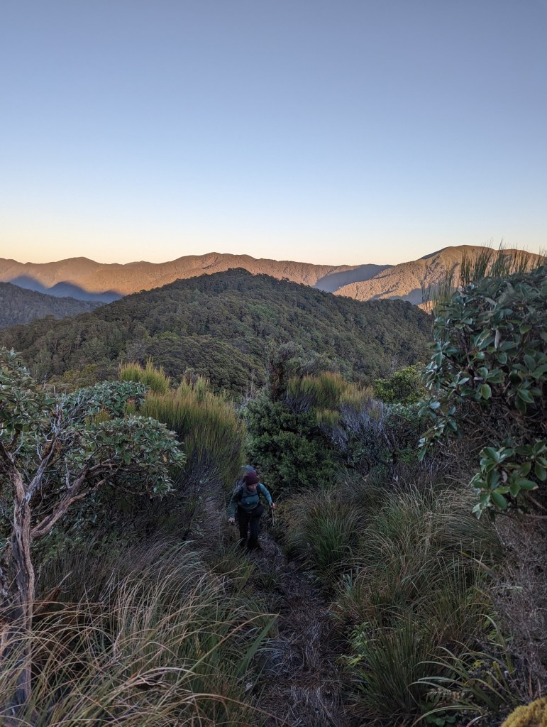 We leave the hut shortly after sunrise this morning because the road is long again and the daylight hours are still few. We also say goodbye to the team of kiwis who are going to another ridge parallel to ours. They were very nice but we won’t regret them too much because one of them made the hut shake all night long with his snoring. It was brutal. Even his two friends teased him a bit because of that…
