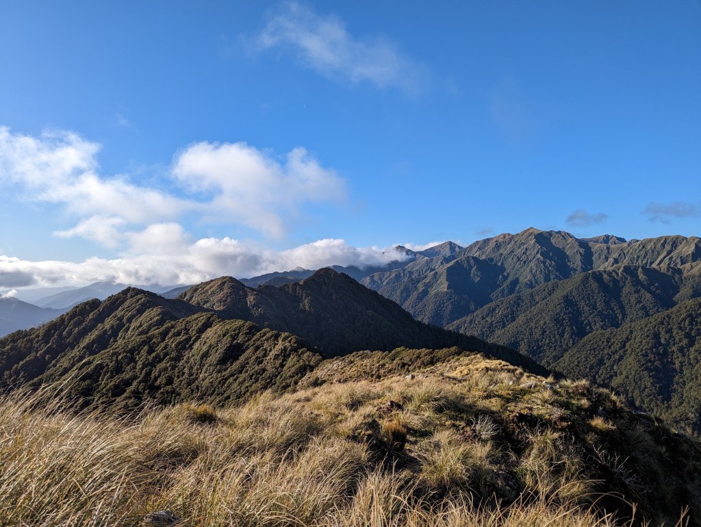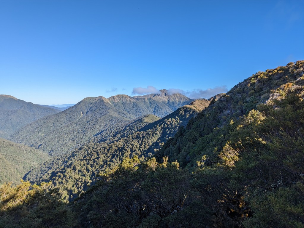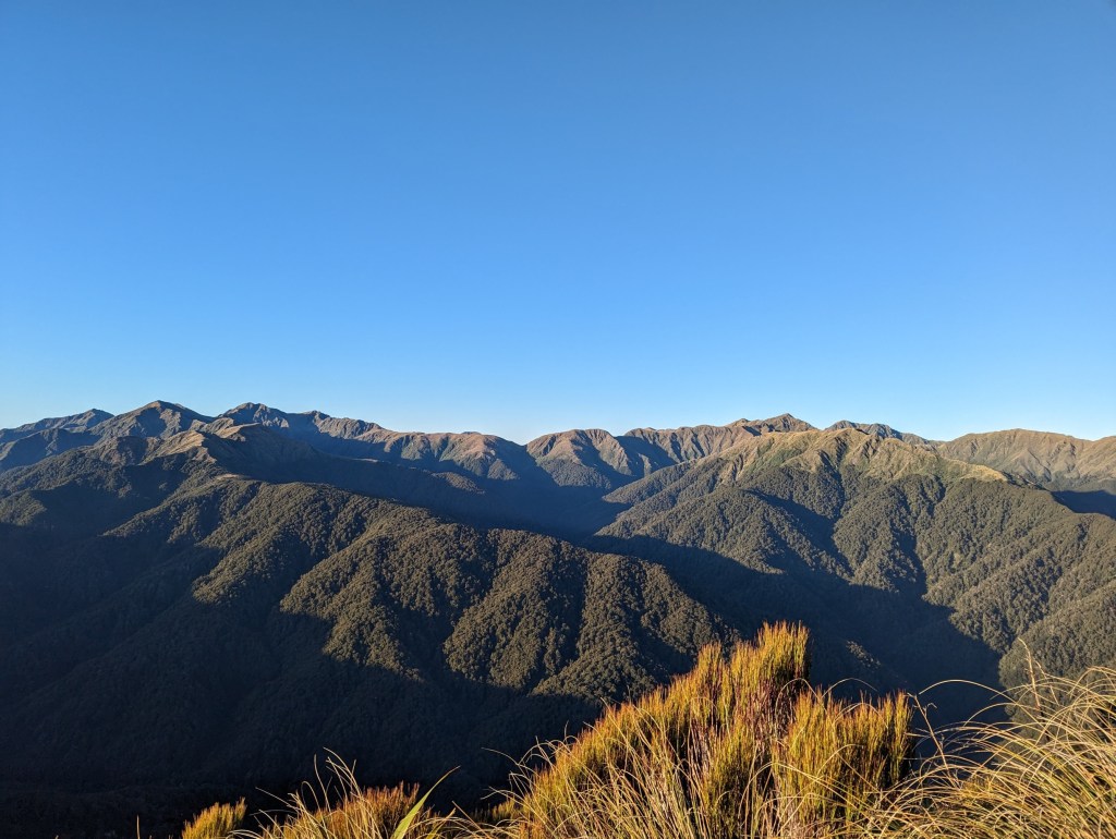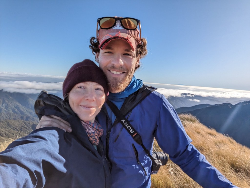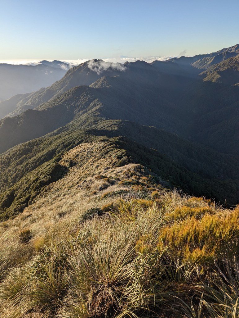 We leave the hut shortly after sunrise this morning because the road is long again and the daylight hours are still few. We also say goodbye to the team of kiwis who are going to another ridge parallel to ours. They were very nice but we won’t regret them too much because one of them made the hut shake all night long with his snoring. It was brutal. Even his two friends teased him a bit because of that…