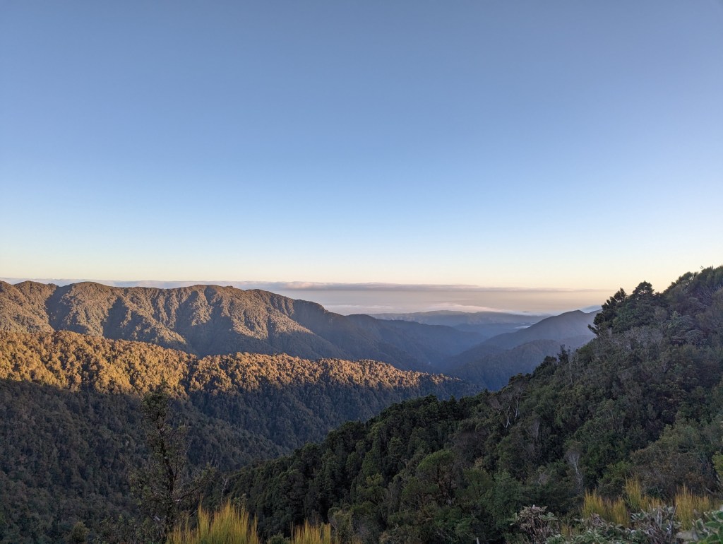 Finally, it is around 4:15 pm when we arrive at Nichols Hut in which we will spend the night. Unfortunately, it is nestled on the southeast side of the mountain and is therefore already in the shade… We also discover with horror that there is no more wood in the hut! We take advantage of the last light of the day to try to find something but, as we are above the forest, there are only wet bushes lying around. We can see that we are not the only ones to have found ourselves in this situation because some of these bushes show traces of sawing. We’ll do what we can with that but the night promises to be cold…