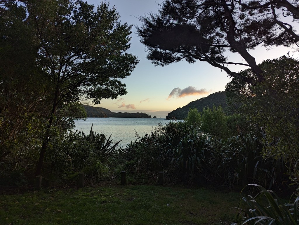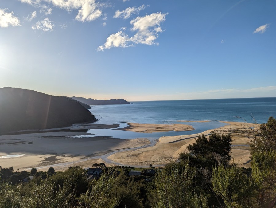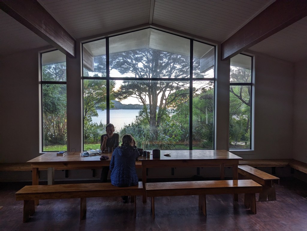 Le chemin continue ensuite à alterner entre plages et forêts jusqu’à notre destination du jour que nous atteignons 3 heures plus tard : Awaroa Hut. C’est une jolie hut, un peu plus ancienne que celle de la veille mais très confortable. On y fait la connaissance d’un couple d’anglais vivant à Christchuch qui sont sur le point d’aller visiter la Suisse. On échange alors avec grand plaisir plein de recommandations de lieux à visiter.