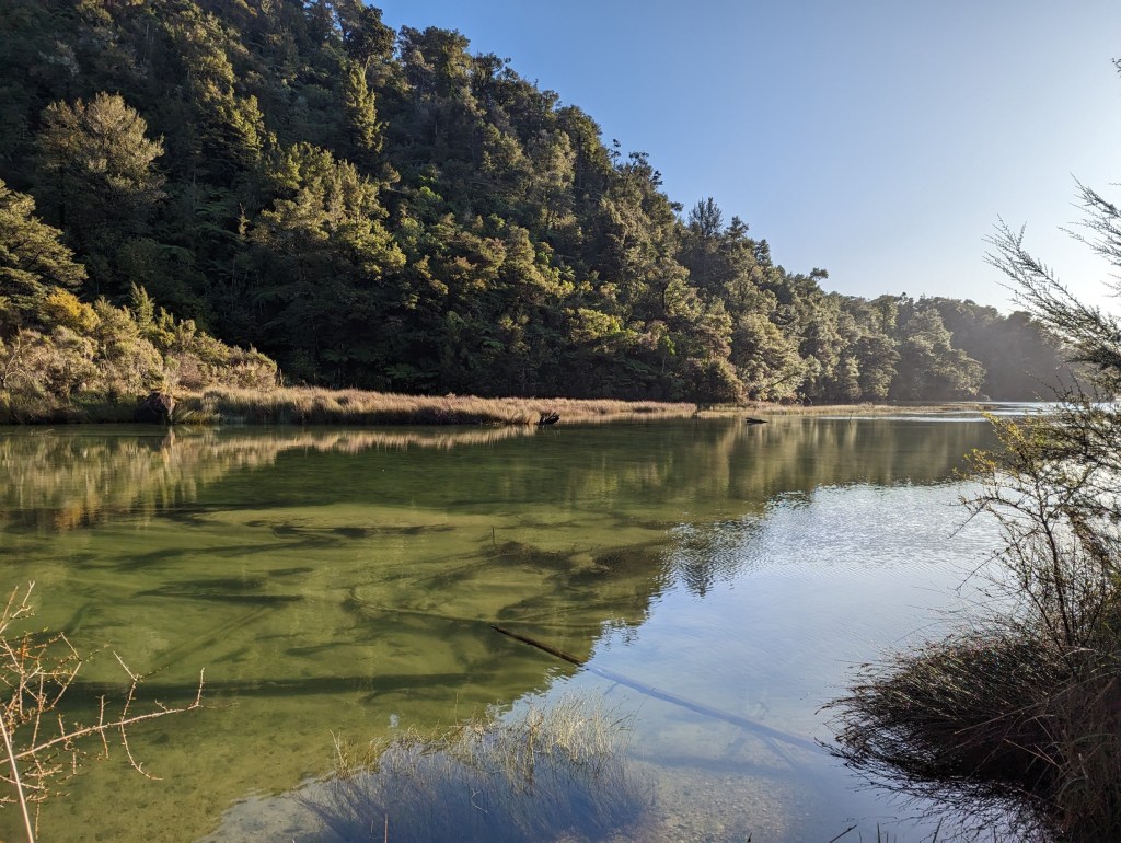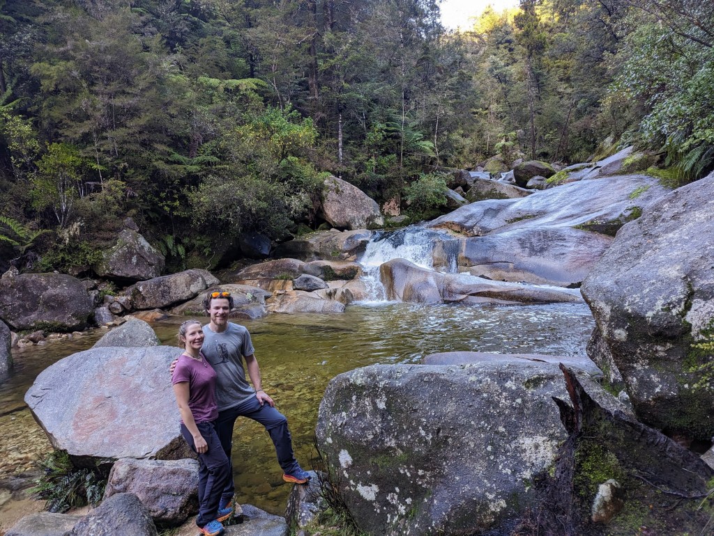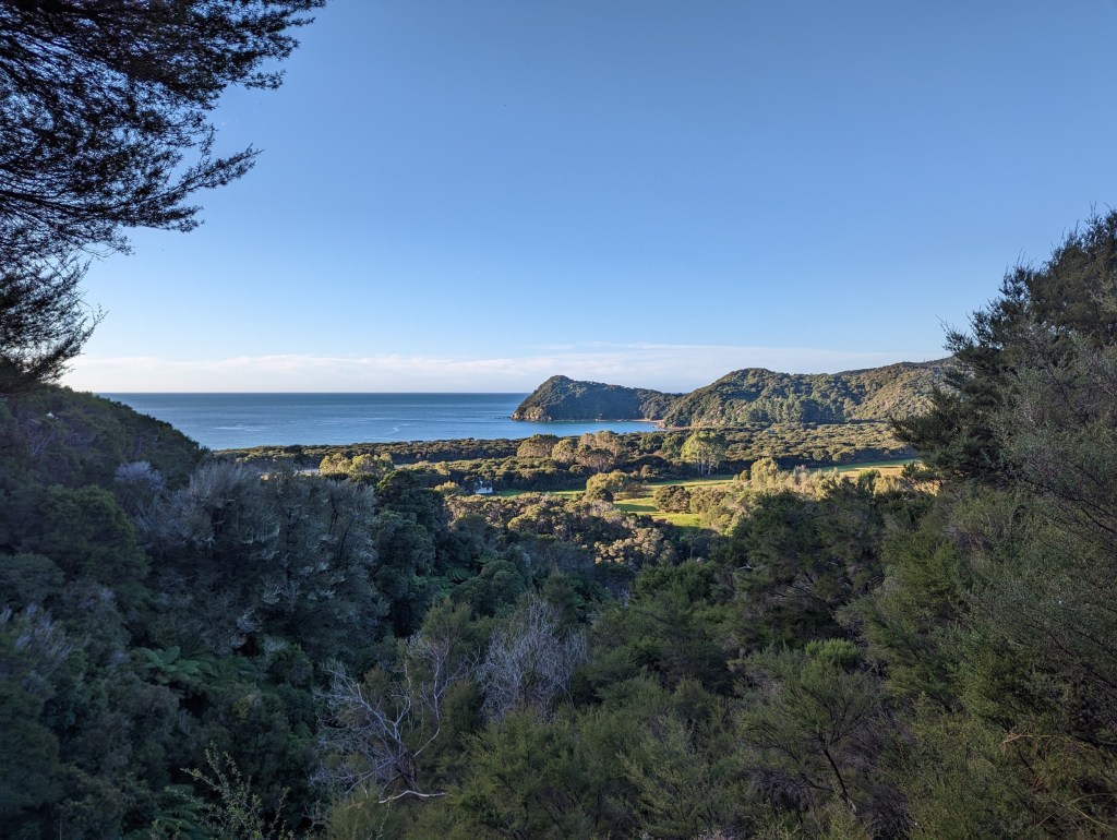 On continue ainsi sur cet excellent chemin à zigzaguer le long de la côte jusqu’à ce qu’on atteigne une autre hut environ 3 heures plus tard. Cette fois, la plage qui la précède est magnifique et en plein soleil alors nous décidons de faire trempette. L’eau est bien froide, probablement autour des 18 degrés, mais ça fait le plus grand bien. Par contre nos meilleures ennemies les sandflies sont aussi de la partie ce qui nous force à continuer notre chemin jusqu’à la hut pour y manger notre lunch à l’abri.
