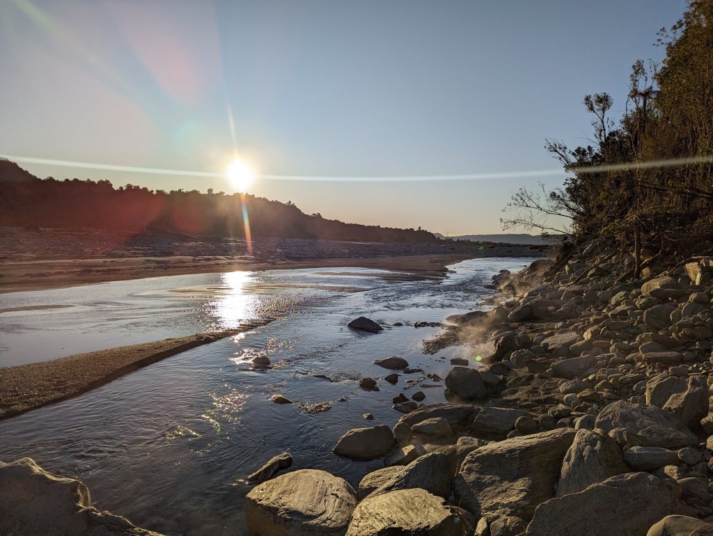 Les sources d’eau chaude sont sur le côté d’une grande rivière et des personnes ont déjà aménagé quelques petits bassins avec des pierres. L’eau est un pur régal bien que parfois brûlante. Et pour une fois en Nouvelle-Zélande, nous ne sommes pas emmerdés par les sandflies…