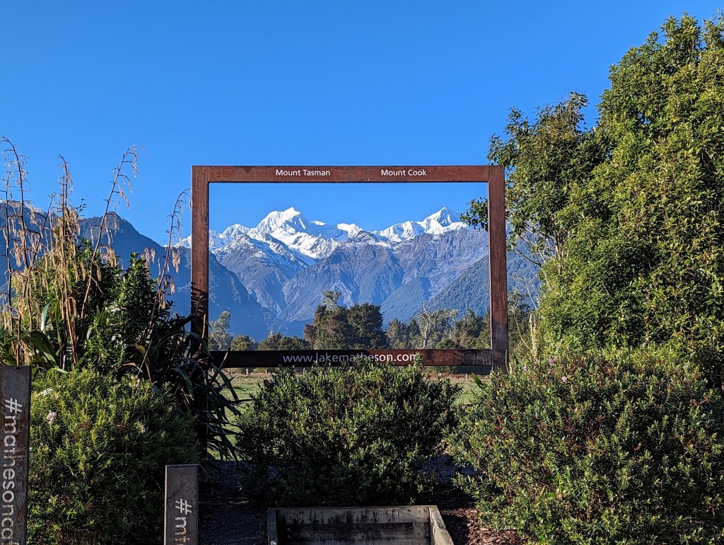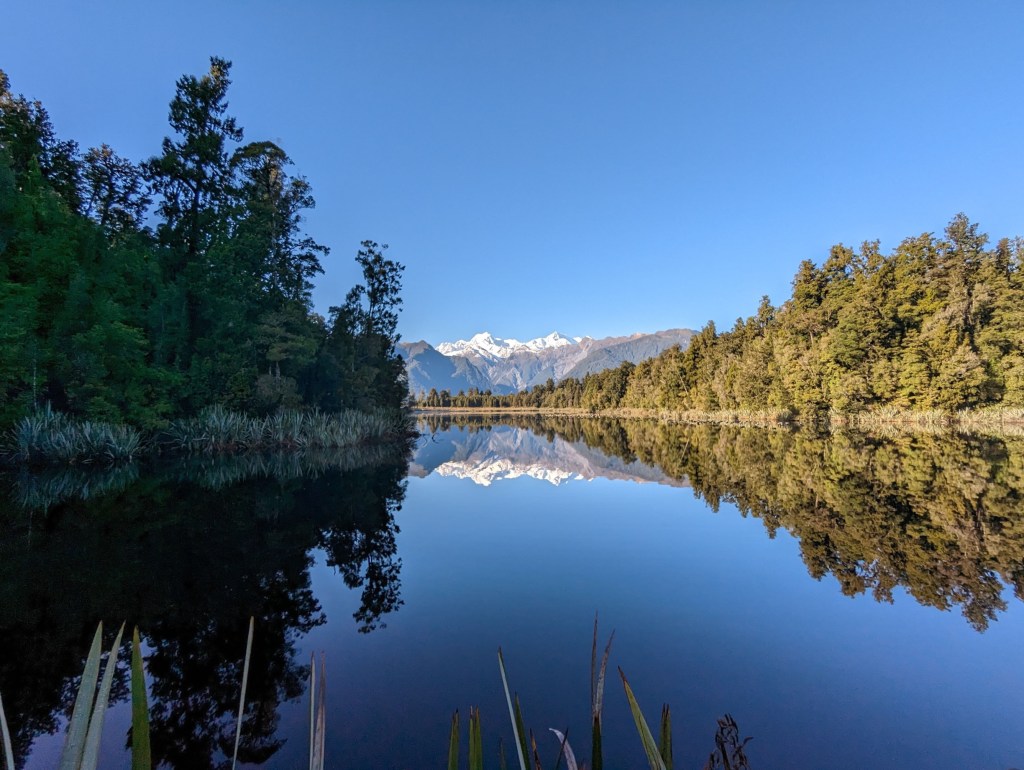 On continue alors jusqu’au petit village de Fox Glacier où nous allons passer la nuit. Mais avant ça, nous allons jeter un œil au Matheson Lake d’où il est possible de voir les sommets des Mt. Tasman et Mt. Cook en réflexion sur le lac. Une fois sur place, c’est un peu nuageux mais quand même très impressionnant.