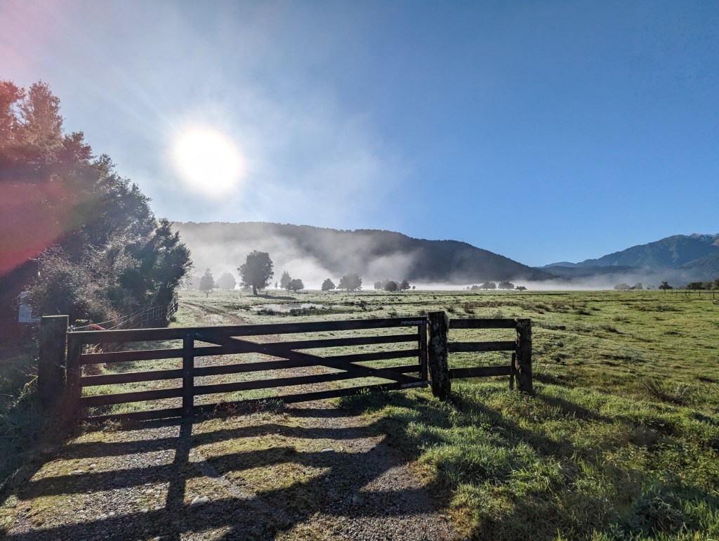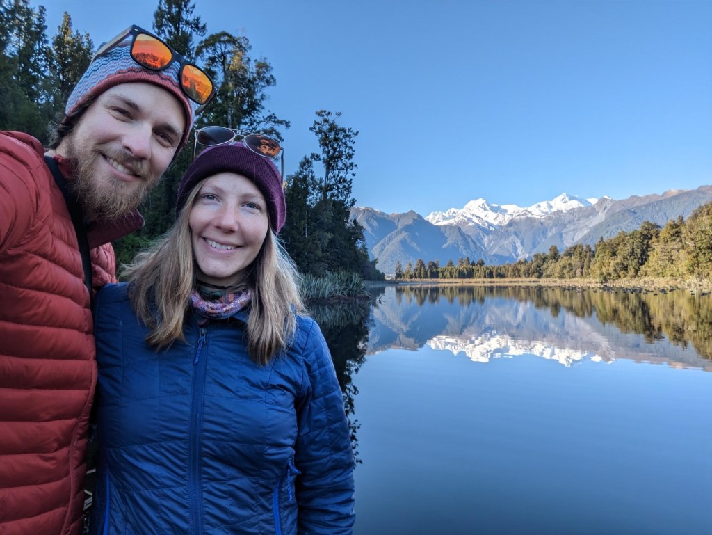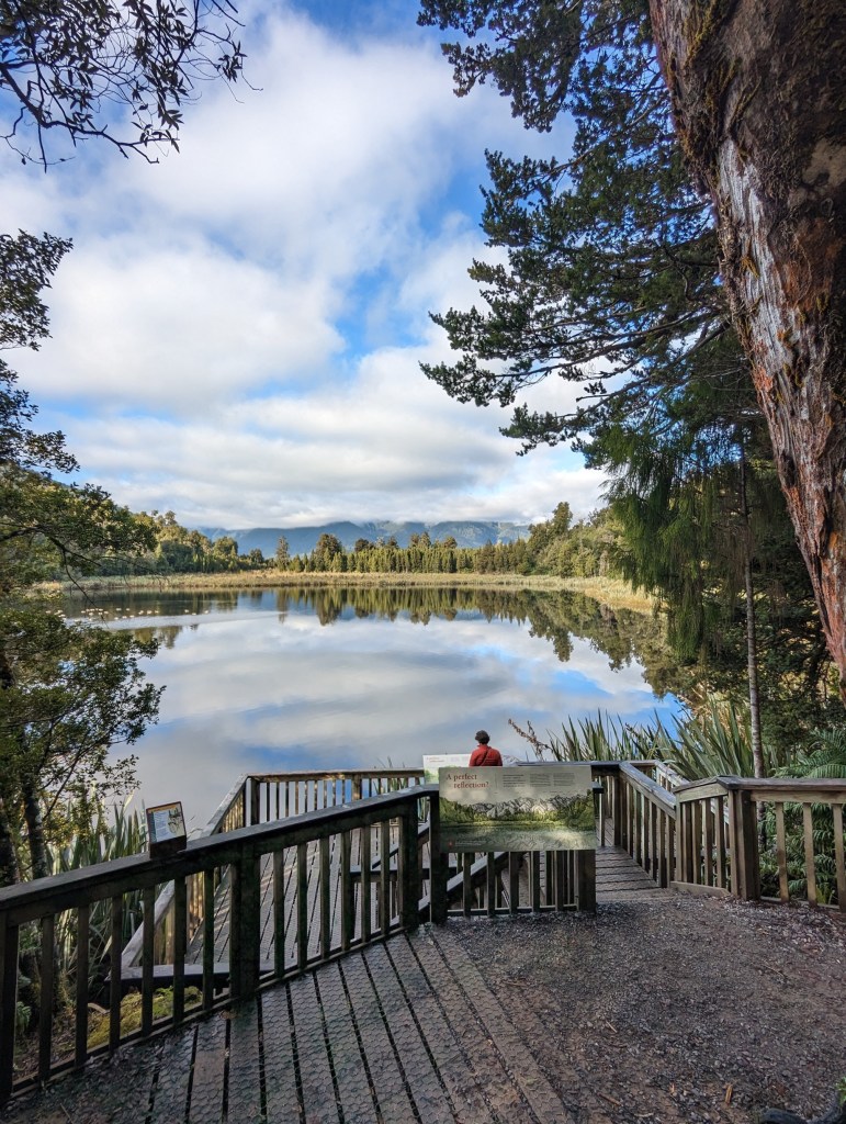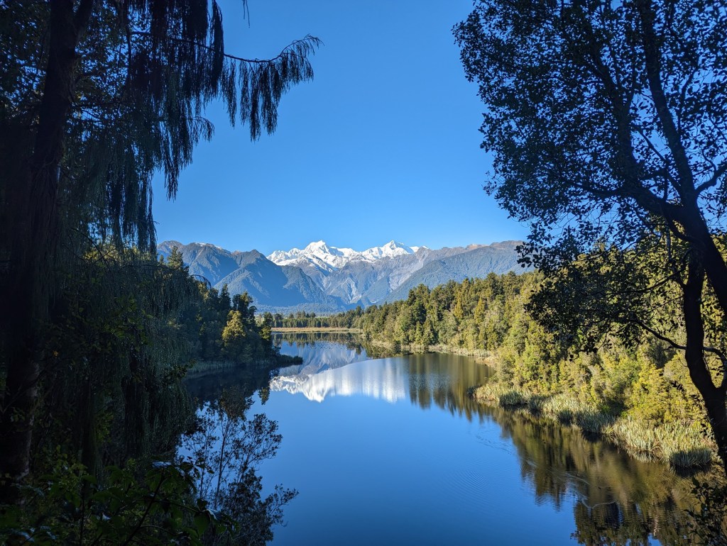 On avait initialement prévu d’aller marcher jusqu’à une hut appelée Welcome Flat Hut qui se trouve au beau milieu de sources d’eau chaude dans lesquelles il est possible de se baigner. Mais pris d’une grosse flemme (et nos genoux ne se sont pas encore remis), nous n’avons pas le courage de parcourir les 17km à pied jusqu’à la hut. Nous décidons alors de refaire un rapide détour au Matheson Lake car tous les nuages de la veille se sont dissipés et la vue devrait être encore plus belle.