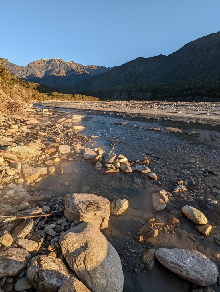 En continuant vers le sud, notre route passe près du Franz Josef Glacier que nous décidons d’aller voir. Il est normalement possible d’aller le voir de très près mais nous découvrons très vite que le sentier officiel est bloqué car une bonne partie aurait été emporté par la rivière. Et malheureusement, de là où nous sommes, le glacier n’est plus visible tellement il a fondu. C’est très triste et un peu décevant…