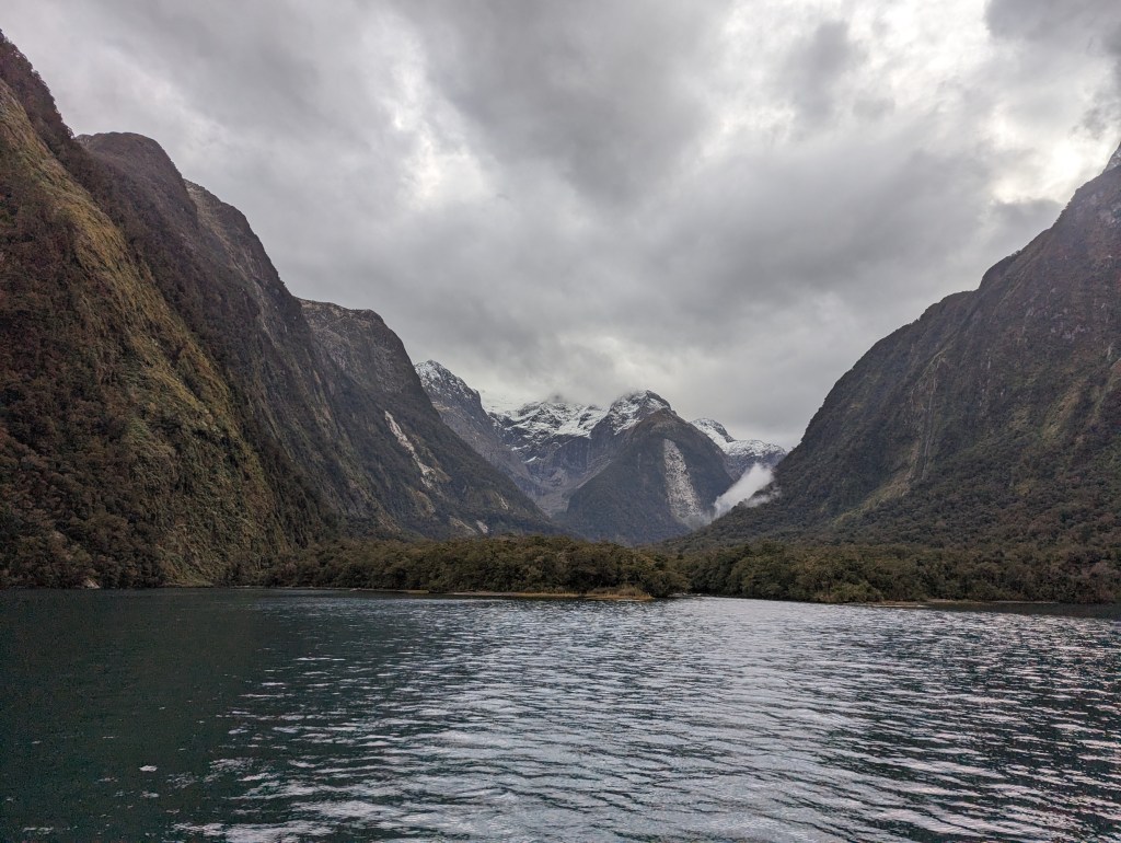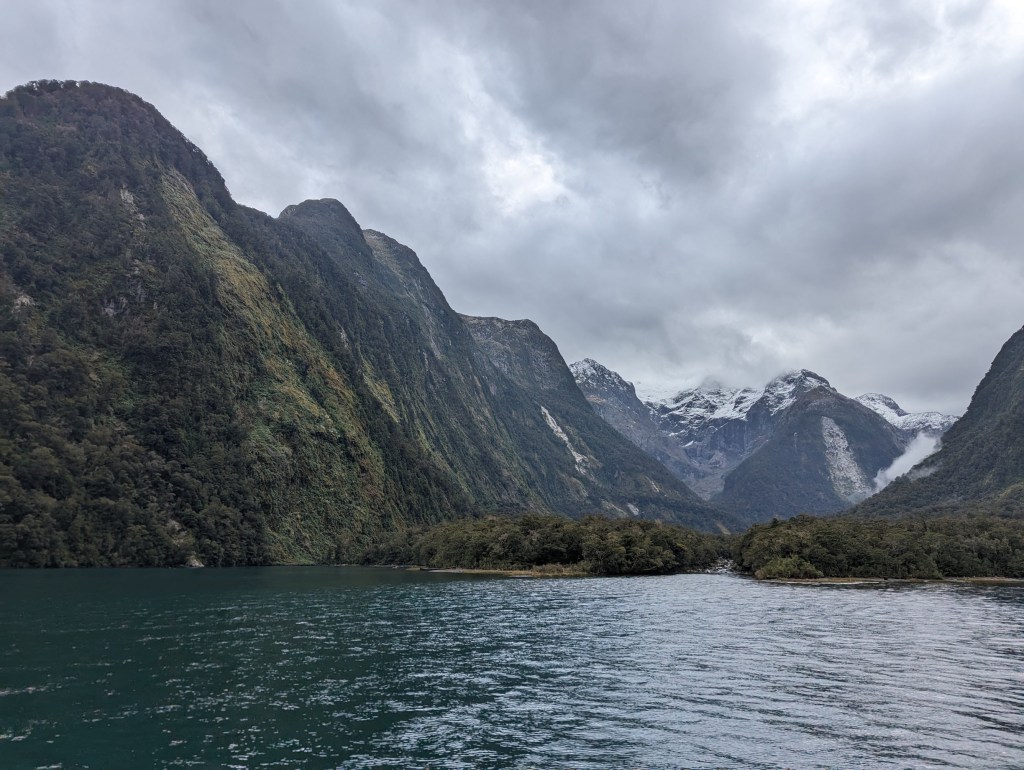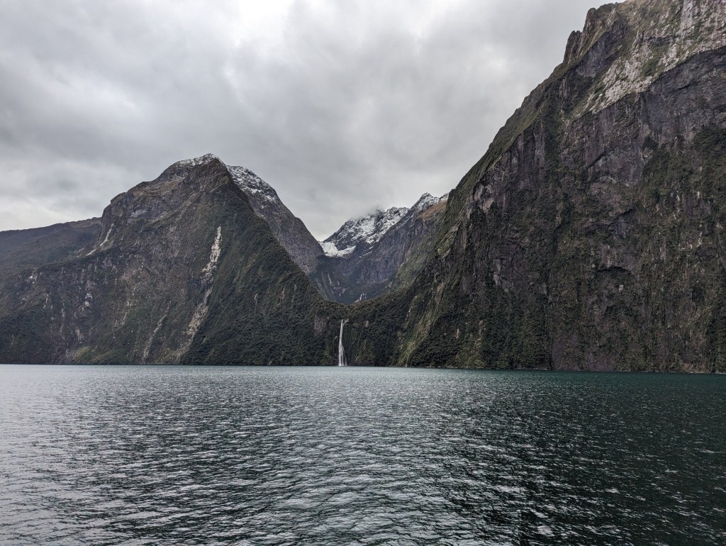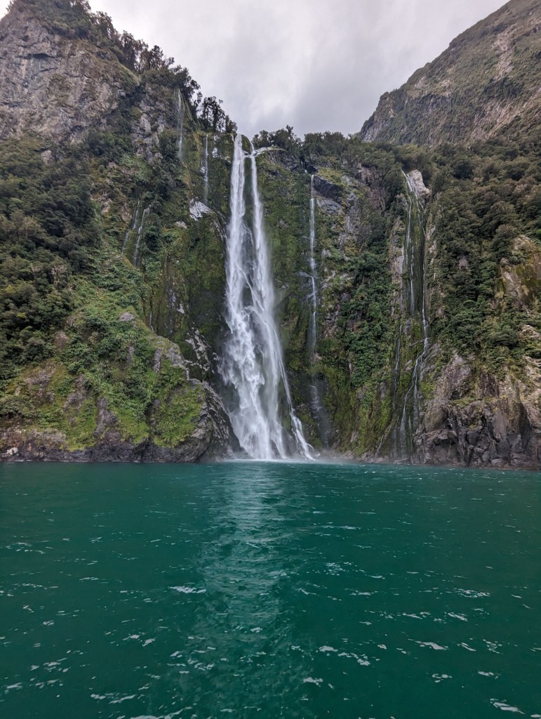 Par contre, le clou du spectacle est vraiment le Milford Sounds lui-même et se voit le mieux depuis le pont d’un bateau. Ses vertigineuses falaises de plusieurs centaines de mètres couvertes d’arbres tenant tant bien que mal à la roche lisse et plongeant tout droit dans l’eau du fjord sont vraiment spectaculaires. D’autant plus que le bateau nous amène à à peine quelques mètres d’elles et de certaines cascades. Ça en vaut bien la peine.