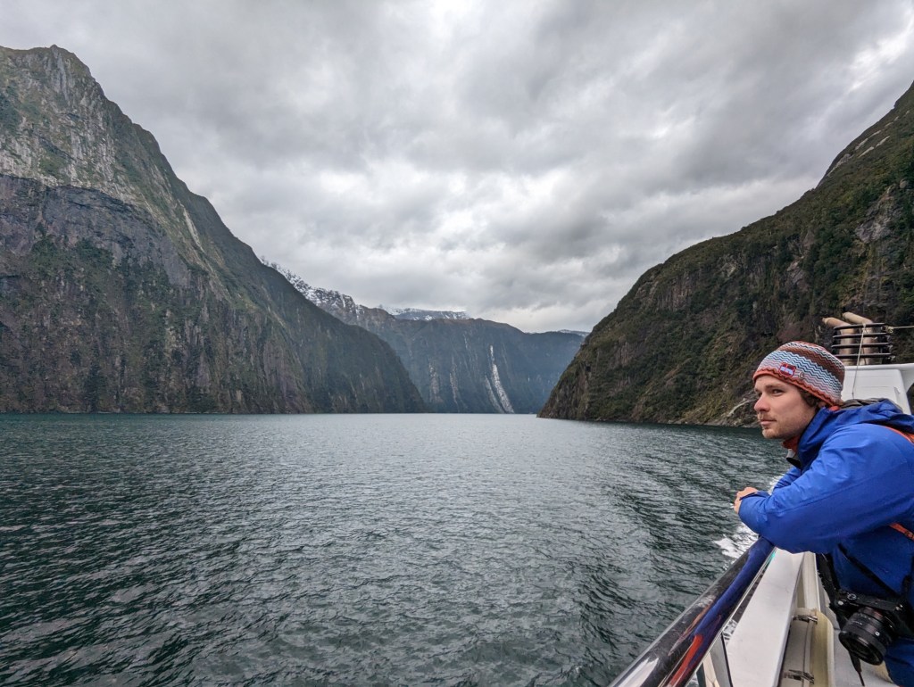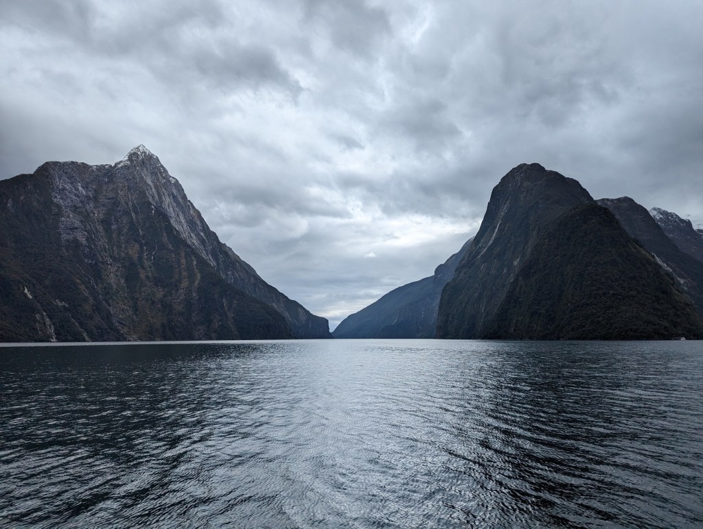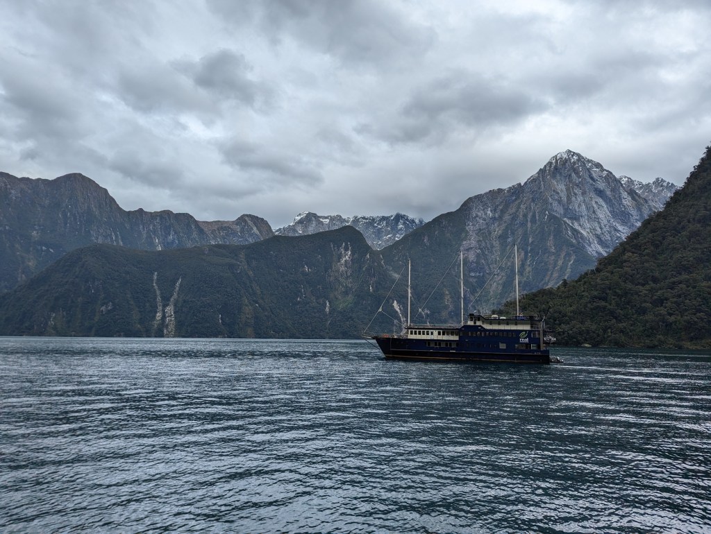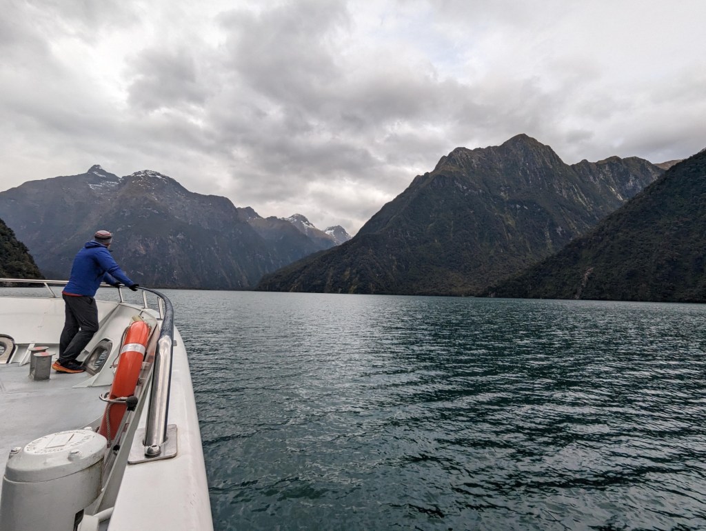 Par contre, le clou du spectacle est vraiment le Milford Sounds lui-même et se voit le mieux depuis le pont d’un bateau. Ses vertigineuses falaises de plusieurs centaines de mètres couvertes d’arbres tenant tant bien que mal à la roche lisse et plongeant tout droit dans l’eau du fjord sont vraiment spectaculaires. D’autant plus que le bateau nous amène à à peine quelques mètres d’elles et de certaines cascades. Ça en vaut bien la peine.