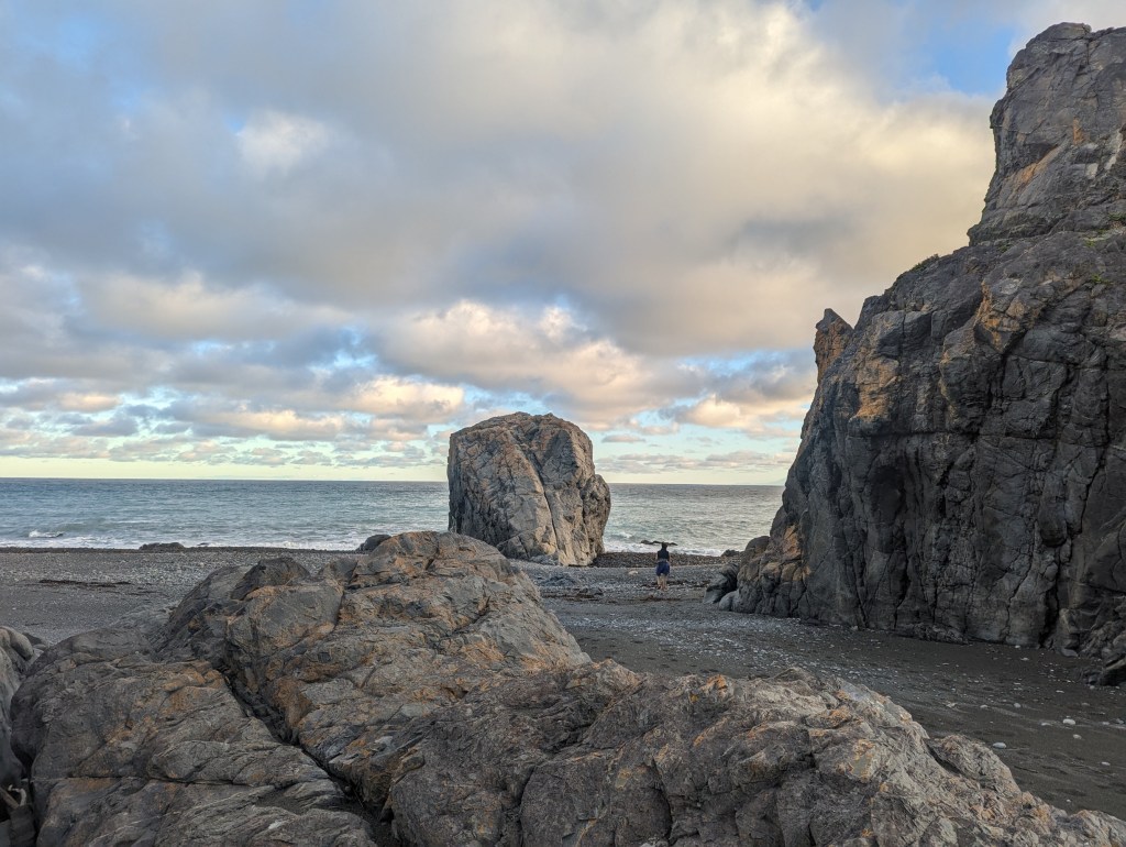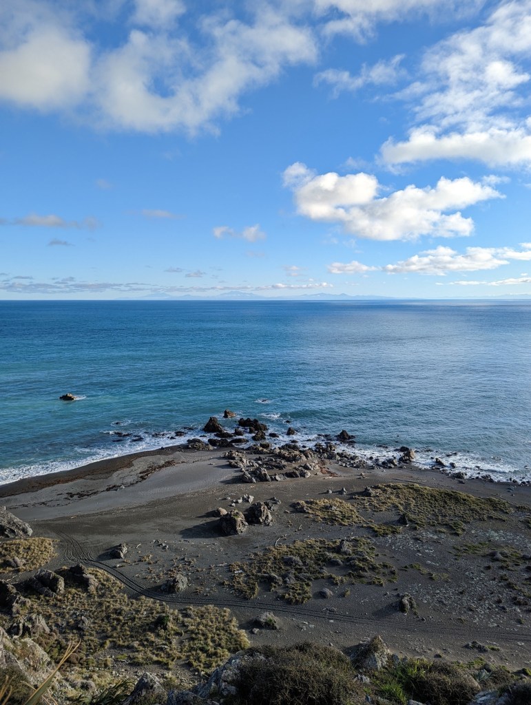 Mais à chaque brève période de beau temps, nous avons filé en vitesse vers de super points de vue. Un des plus sympa fut le East Harbour Regional Park avec sa Baring Head Lighthouse qui domine du haut d’une falaise vertigineuse une plage avec de nombreux rochers parfois équipés pour la grimpe. Malheureusement, sans matériel adéquat, on n’a pas pu en profiter 😢.