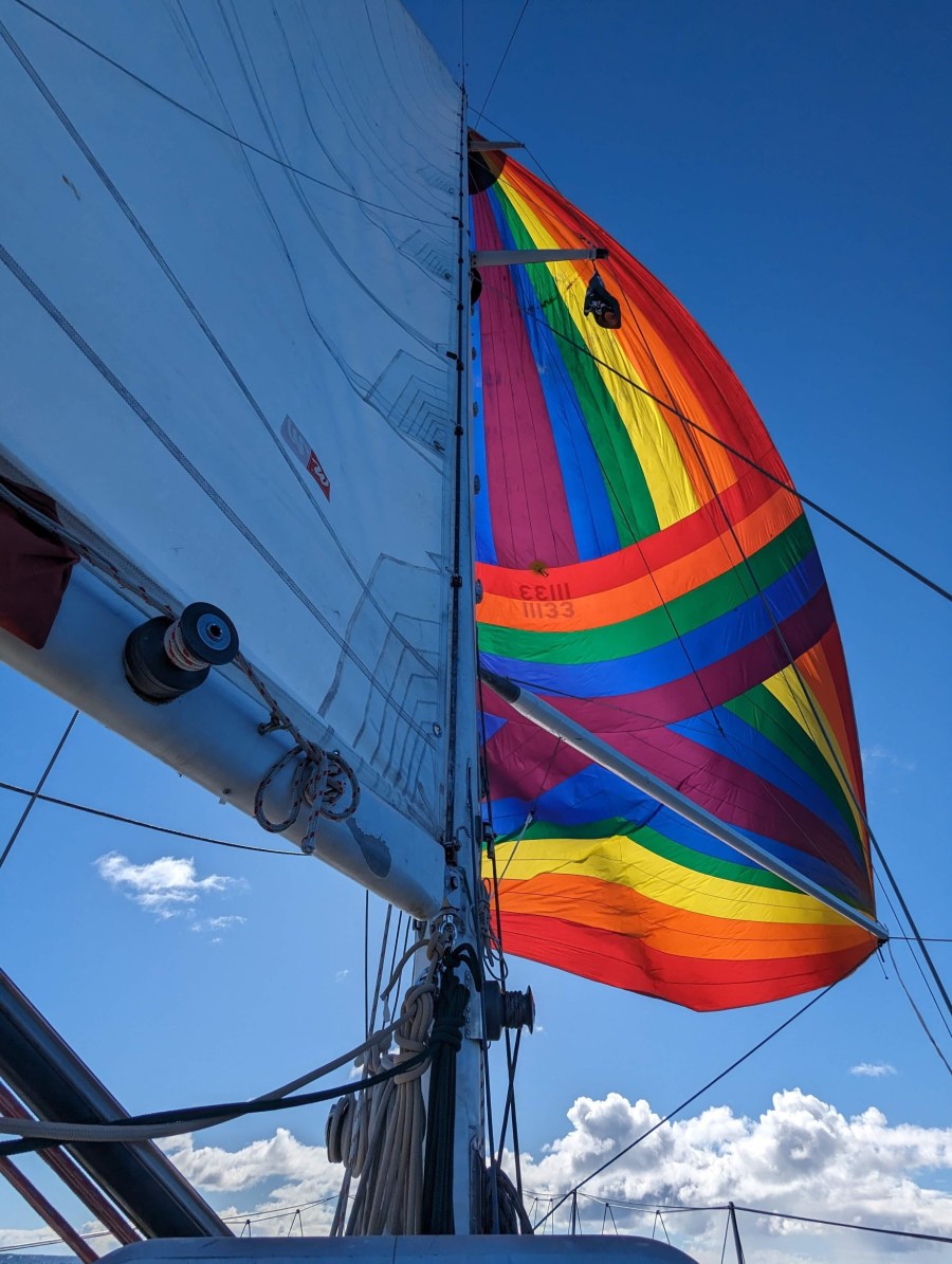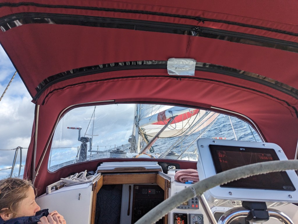Qu’est-ce que ça fait du bien de pouvoir ressortir les voiles et éteindre ce moteur. Les vibrations et le bruit constants donnaient le mal de tête et rendait le sommeil plus difficile. Dès qu’il s’éteint, on a tous l’impression de se relaxer d’un coup.