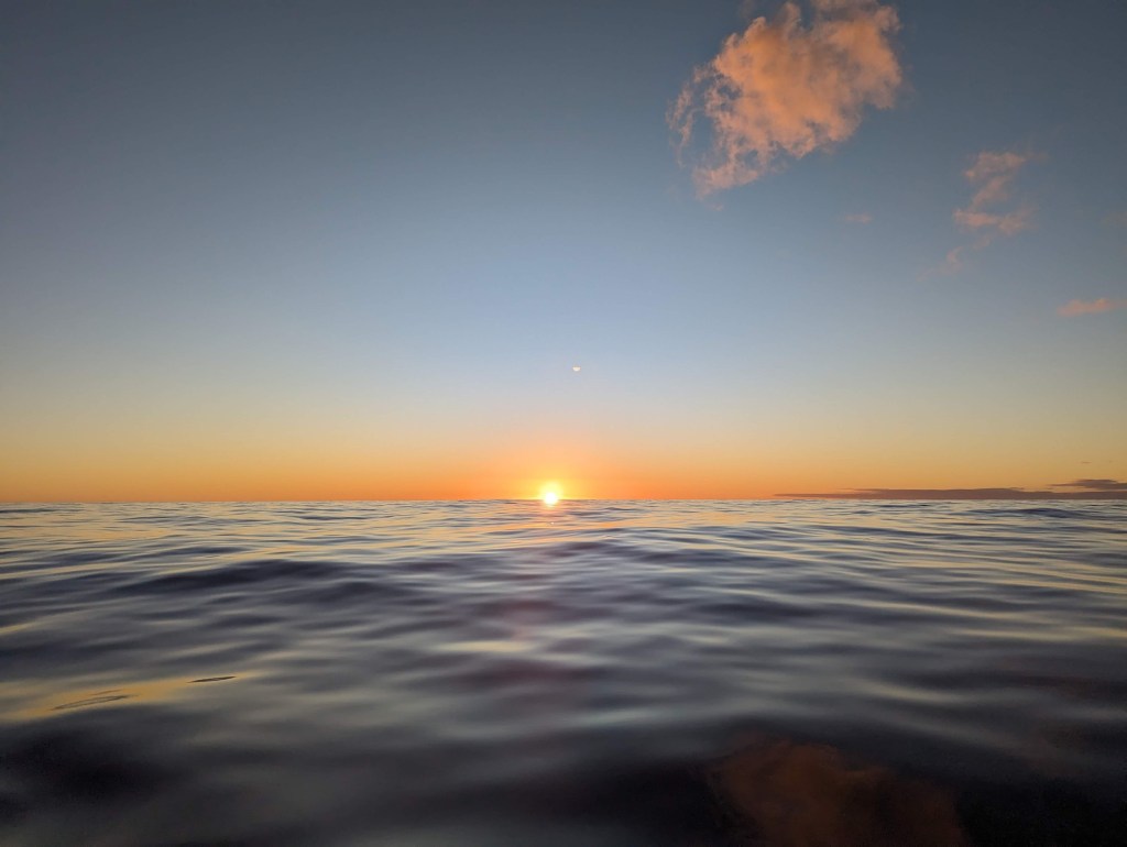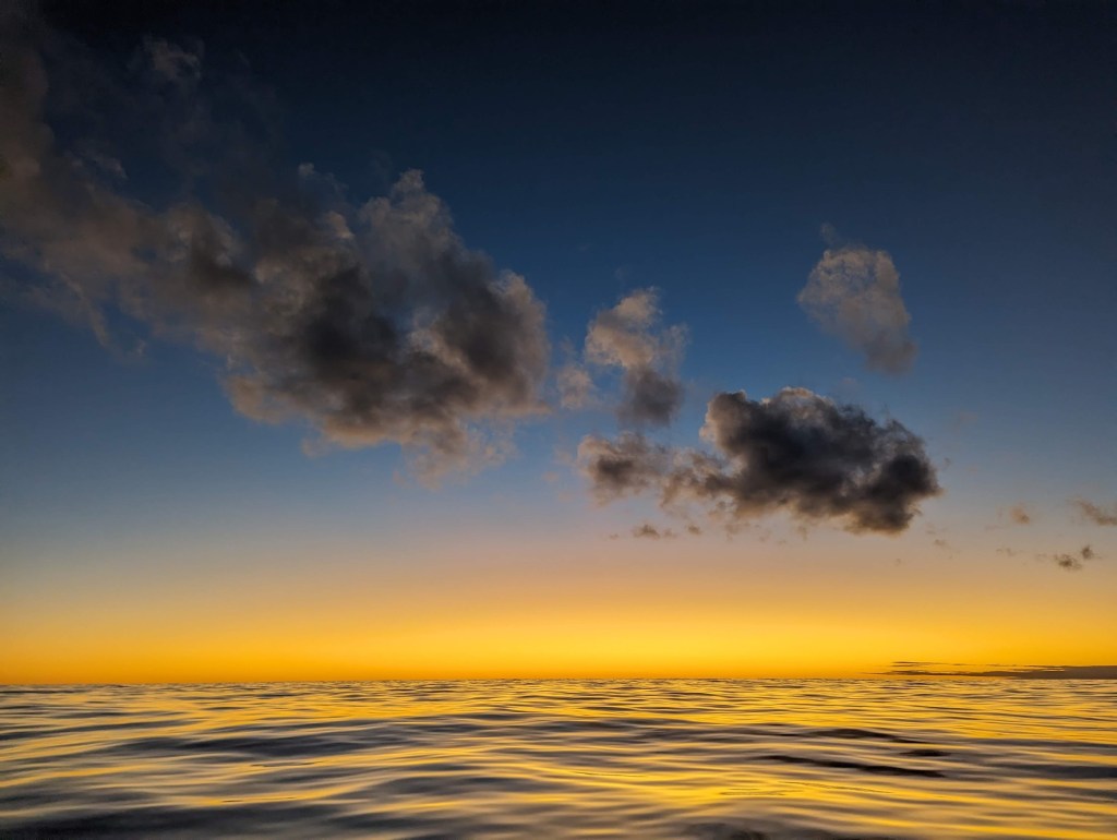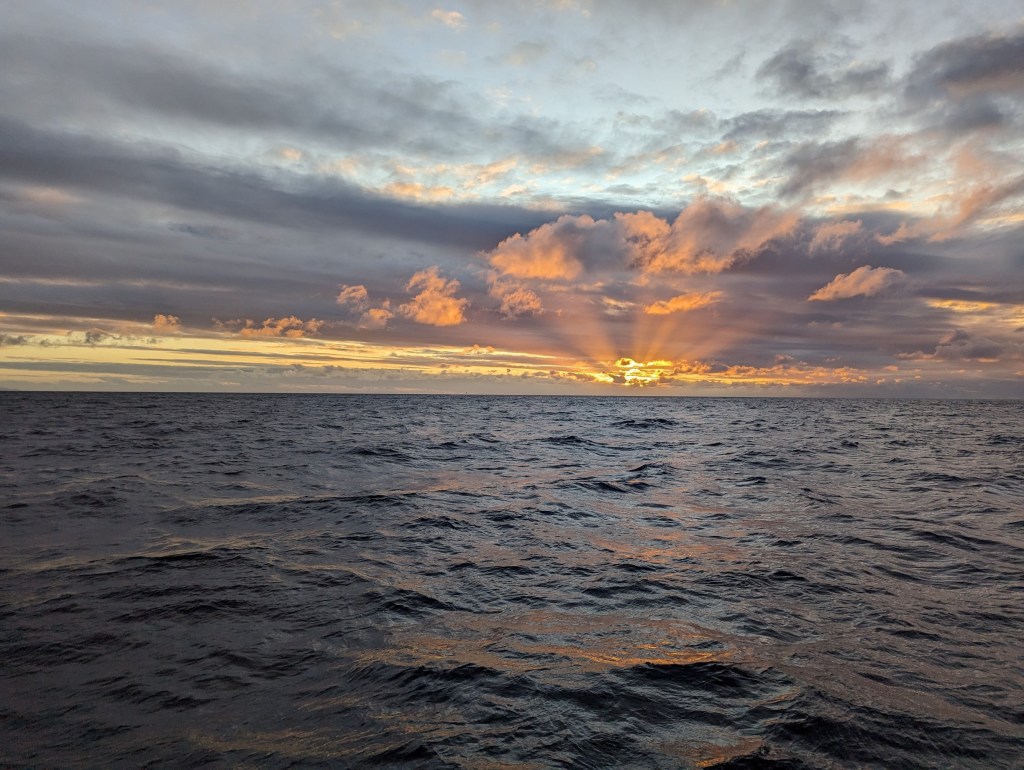 Le bon vent ne dure finalement qu’une journée, après quoi, nous nous retrouvons à nouveau dans un énorme trou sans vent. À un tel point que la surface de l’océan devient aussi lisse que de l’huile. C’est magnifique, surtout au coucher du soleil mais c’est un enfer pour avancer. Nous prenons alors la décision d’allumer le moteur et de parcourir le plus de Miles possible vers l’autre côté de ce trou.