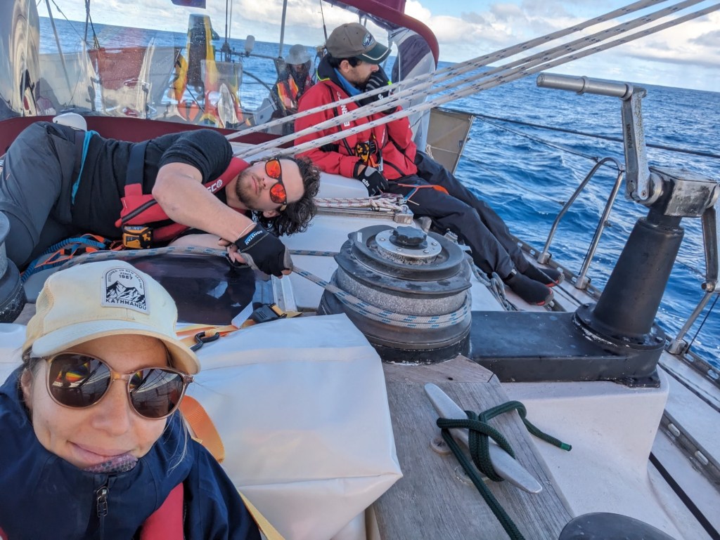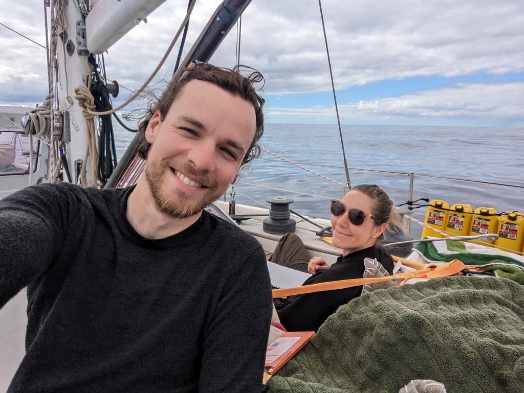 À partir de là, une routine s’installe et on sent nos corps s’habituer et le mal de mer commence à passer. Mag’ monte dans le cockpit de plus en plus souvent et finit par enfin faire un quart entier au soir du troisième jour 🙂 Par contre on ressent encore des nausées monter à chaque fois qu’on descend dans la cale. Mais ça va quand même en s’améliorant 😅