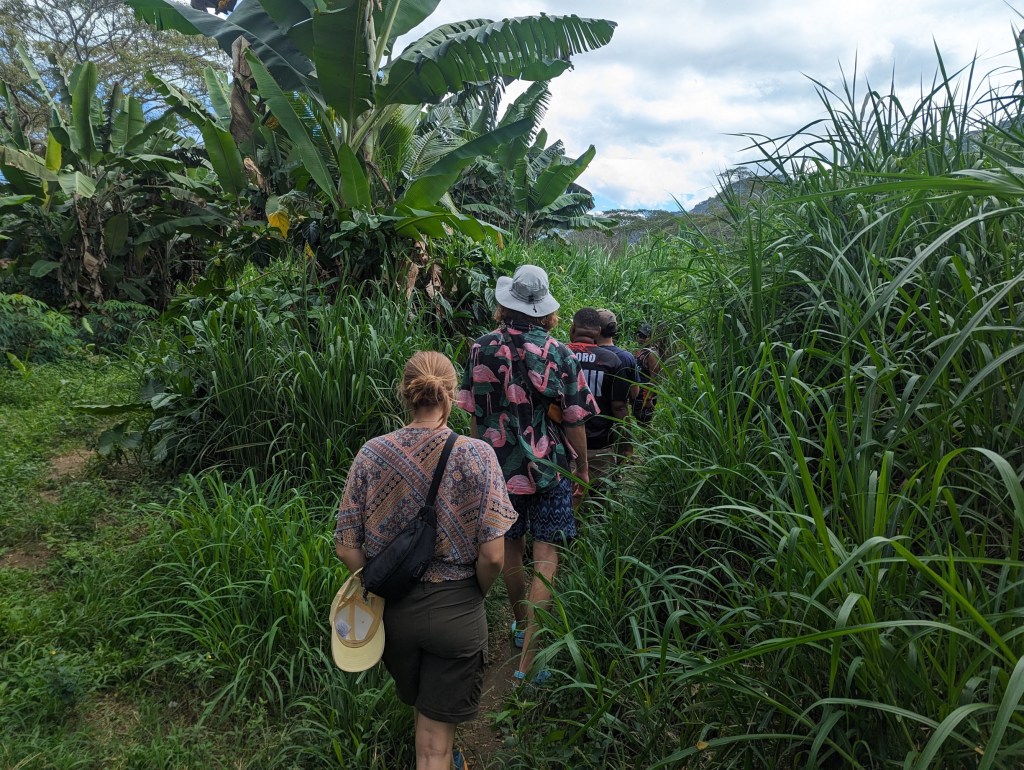 Nous sommes ensuite guidés par tout ce petit groupe littéralement à travers champs où on nous montre tout ce qu’ils font pousser (kasavas, épinards, menthe, citronnelle, etc.) et tout ce qu’ils récupèrent de la nature directement (divers fruits, des piments, des herbes médicinales, etc.). C’est fascinant !