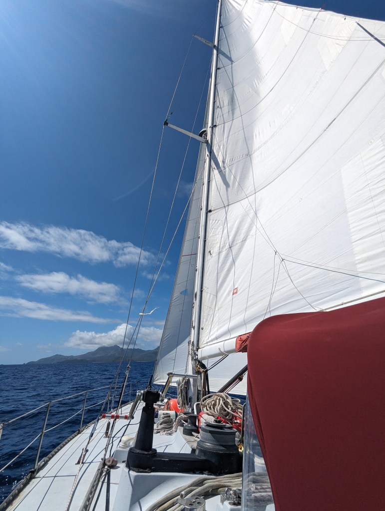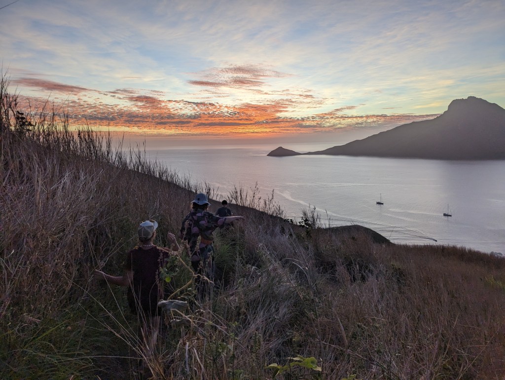 À la tombée du jour, Ernests, Palla et nous décidons de tenter de monter vers un point de vue dominant la baie dans laquelle nous sommes ancrés.