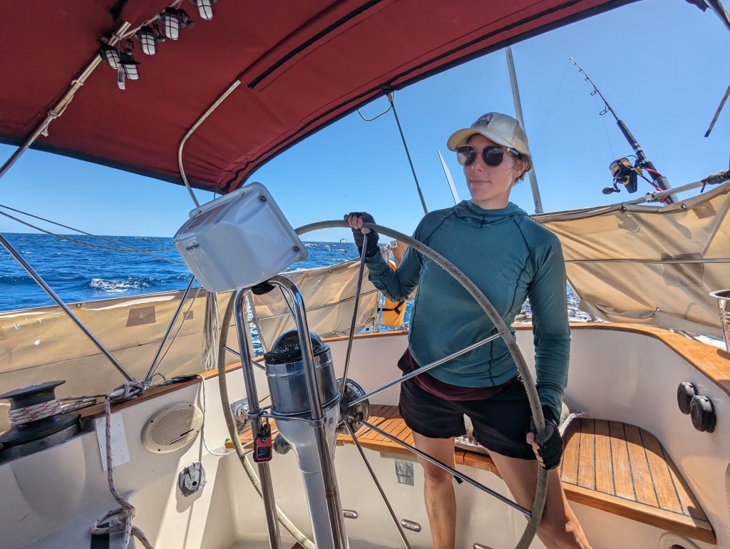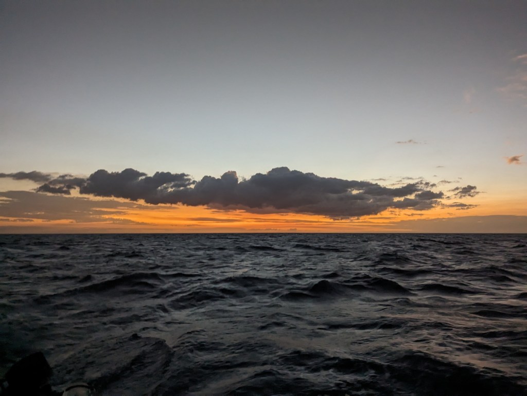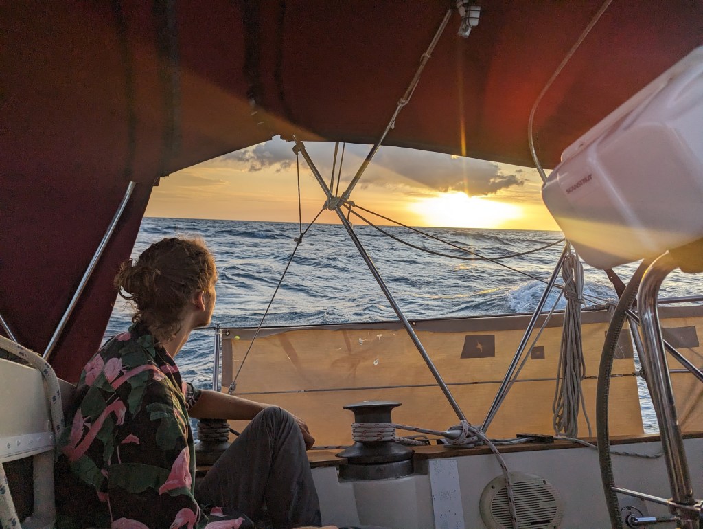 L’océan est légèrement mouvementé, nous avons 1,5 m de houle et je commence la journée à la barre pour m’habituer du rouli. Tout va bien et je reste deux heures à barrer avant de me faire relayer par Raphaël. Ensuite j’enchaîne une série de siestes car j’ai un bon gros coup de fatigue et j’ai mal dormi la veille.