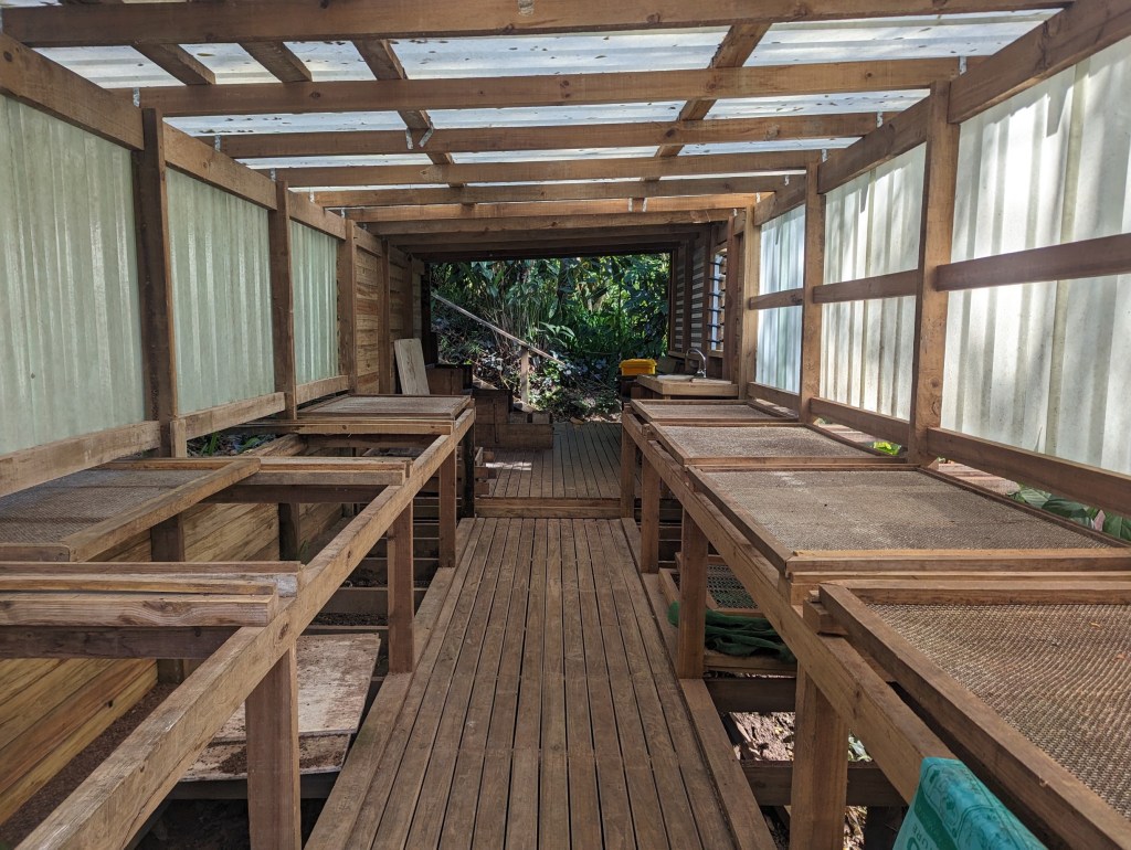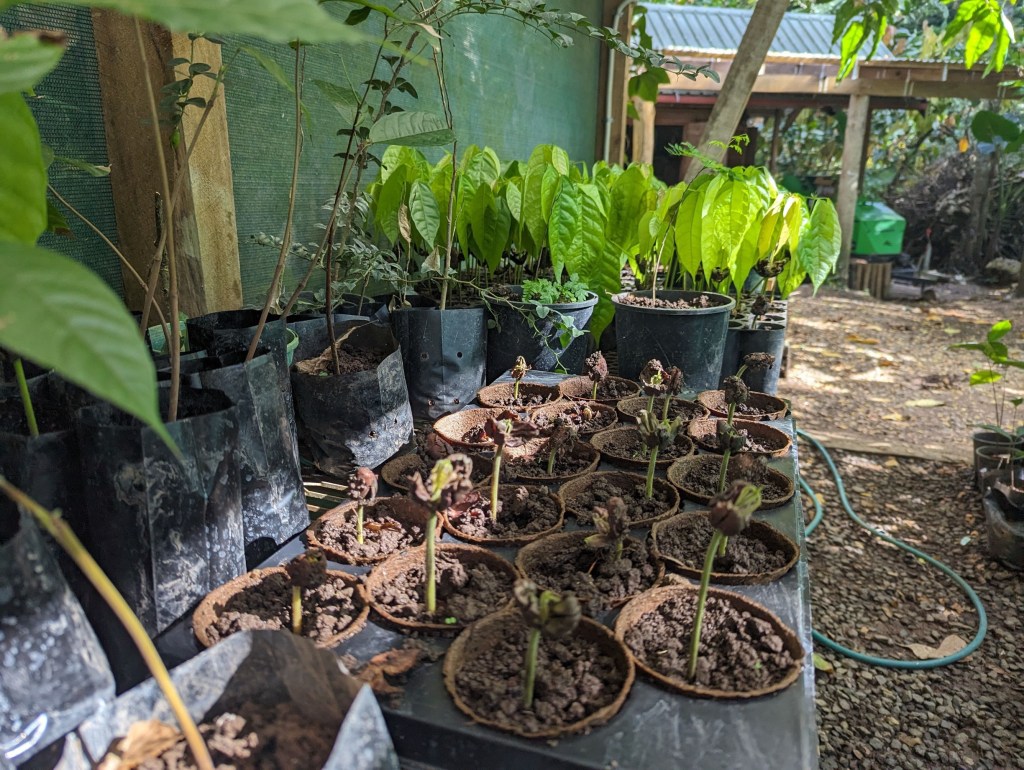 C’est une ferme de 2 hectares au milieu de la jungle sur un terrain en pente. Notre guide nous explique qu’il applique un fascinant système d’agroforesterie mixte pour sa culture qui :